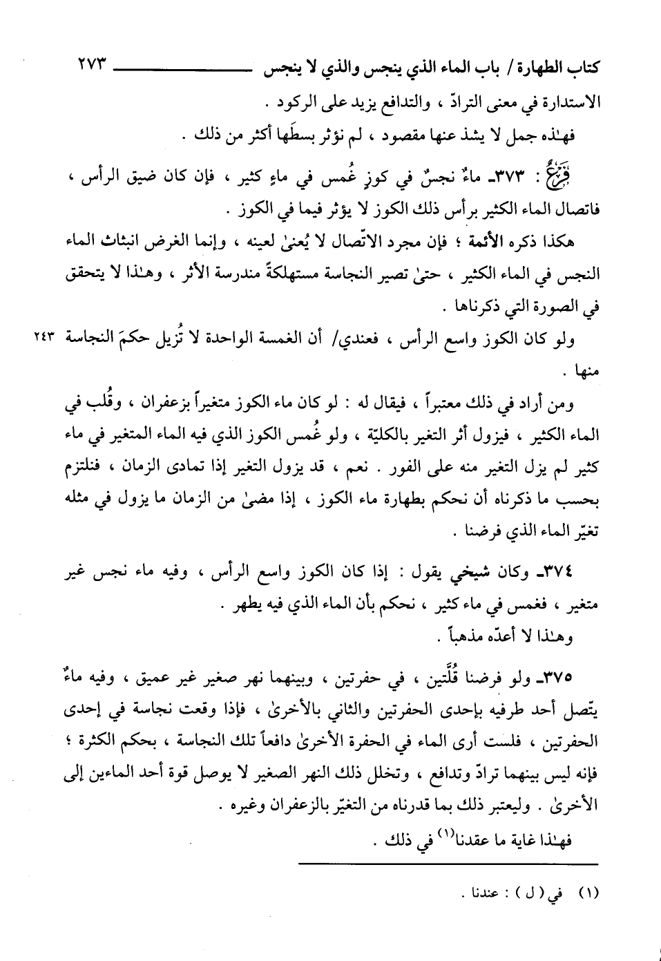 374 - وكان شيخي يقول: إذا كان الكوز واسع الرأس، وفيه ماء نجس غير متغير، فغمس في ماء كثير، نحكم بأن الماء الذي فيه يطهر.