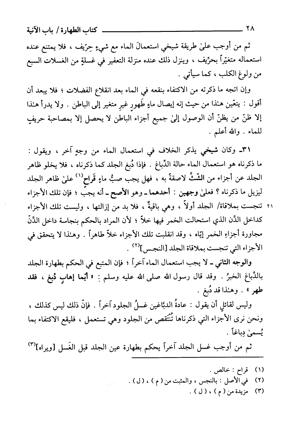 31 - وكان شيخي يذكر الخلاف في استعمال الماء من وجهٍ آخر، ويقول: ما ذكرناه هو استعمال الماء حالة الدِّباغ. فإذا دُبغ الجلد كما ذكرناه، فلا يخلو ظاهر الجلد عن أجزاء من الشّثِّ لاصقةً به، فهل يجب صب ماءٍ قَراحٍ (¬1) على ظاهر الجلد ليزيل ما ذكرناه؟ فعلى وجهين: أحدهما -وهو الأصح- أنه يجب؛ فإن تلك الأجزاء تنجست بملاقاة الجلد أولاً، وهي باقيةٌ، فلا بد من إزالتها، وليست تلك الأجزاء كداخل الدَّن الذي استحالت الخمر فيها خلاً؛ لأن المراد بالحكم بنجاسة داخل الدَّنّ مجاورة أجزاءِ الخمر إيّاه، وقد انقلبت تلك الأجزاء خلاً طاهراً. وهذا لا يتحقق في الأجزاء التي تنجست بملاقاة الجلد [النجس] (¬2).