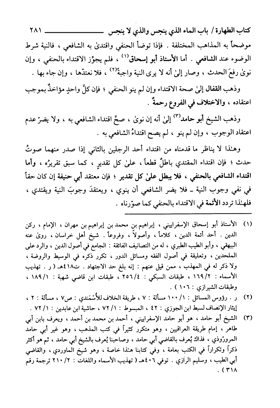 (¬3) الشيخ أبو حامد، هو أبو حامد الإسفراييني، أحمد بن محمد بن أحمد، ويعرف بابن أبي طاهر، إمام طريقة العراقيين، وهو متكرر كثيراً في كتب المذهب، وهو غير أبي حامد المرورّوذي، فذاك يُعرف بالقاضي أبي حامد، وصاحبنا يُعرف بالشيخ أبي حامد، ثم هو أكثر ذكراً وتكراراً في الكتب بعامة، وفي كتابنا هذا خاصة، وهو شيخ الماوردي، والقاضي أبي الطيب، وسليم الرازي. توفي 406 هـ (تهذيب الأسماء واللغات: 2/ 210 ترجمة رقم 318).