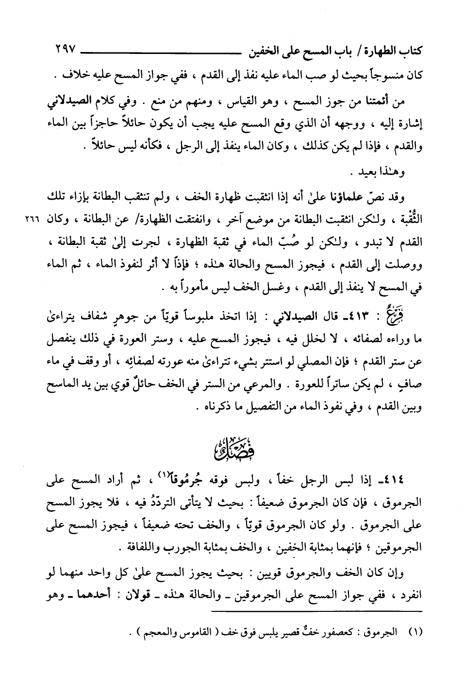 413 - قال الصيدلاني: إذا اتخذ ملبوساً قويّاً من جوهرٍ شفاف يتراءى ما وراءه لصفائه، لا لخلل فيه، فيجوز المسح عليه، وستر العورة في ذلك ينفصل عن ستر القدم؛ فإن المصلي لو استتر بشيء تتراءى منه عورته لصفائِه، أو وقف في ماء صافٍ، لم يكن ساتراً للعورة. والمرعي من الستر في الخف حائلٌ قوي بين يد الماسح وبين القدم، وفي نفوذ الماء من التفصيل ما ذكرناه.