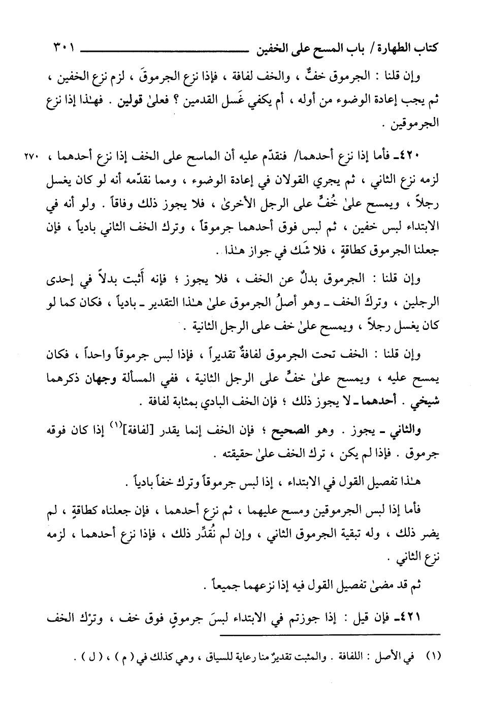 421 - فإن قيل: إذا جوزتم في الابتداء لبسَ جرموقٍ فوق خف، وترْك الخف
