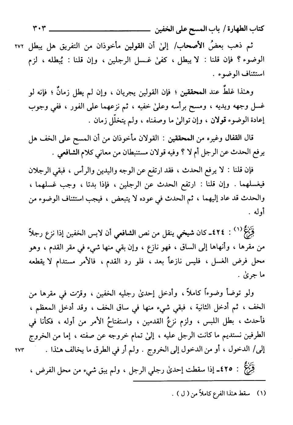 424 - كان شيخي ينقل من نص الشافعي أن لابس الخفين إذا نزع رجلاً من مقرها، وأنهاها إلى الساق، فهو نازع، وإن بقي منها شيء في مقر القدم، وهو محل فرض الغسل، فليس نازعاً بعد، فلو رد القدم، فالأمر مستدام لا يقطعه ما جرى.