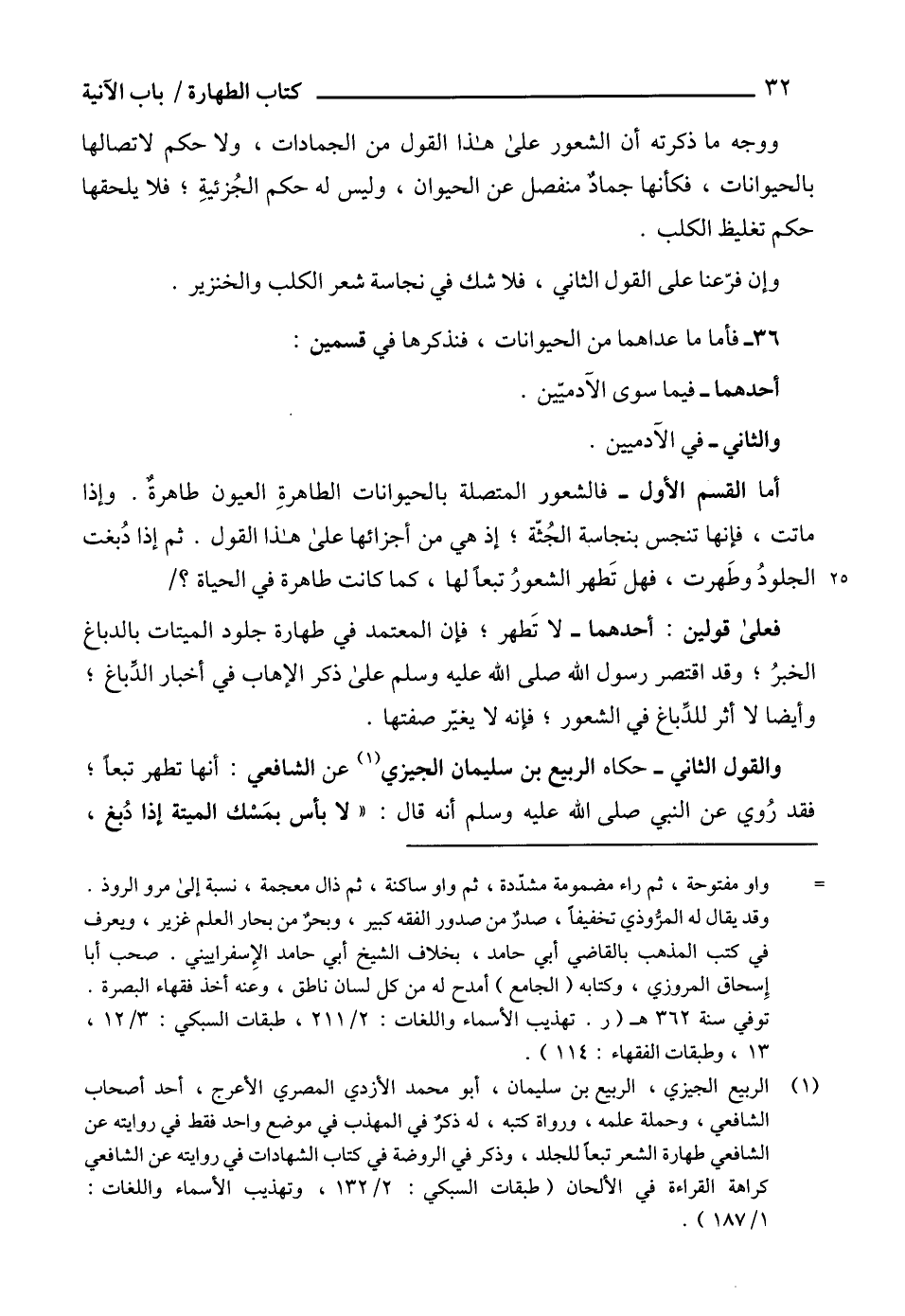 (¬1) الربيع الجيزي، الربيع بن سليمان، أبو محمد الأزدي المصري الأعرج، أحد أصحاب الشافعي، وحملة علمه، ورواة كتبه، له ذكرٌ في المهذب في موضع واحد فقط في روايته عن الشافعي طهارة الشعر تبعاً للجلد، وذكر في الروضة في كتاب الشهادات في روايته عن الشافعي كراهة القراءة في الألحان (طبقات السبكي: 2/ 132، وتهذيب الأسماء واللغات: 1/ 187).