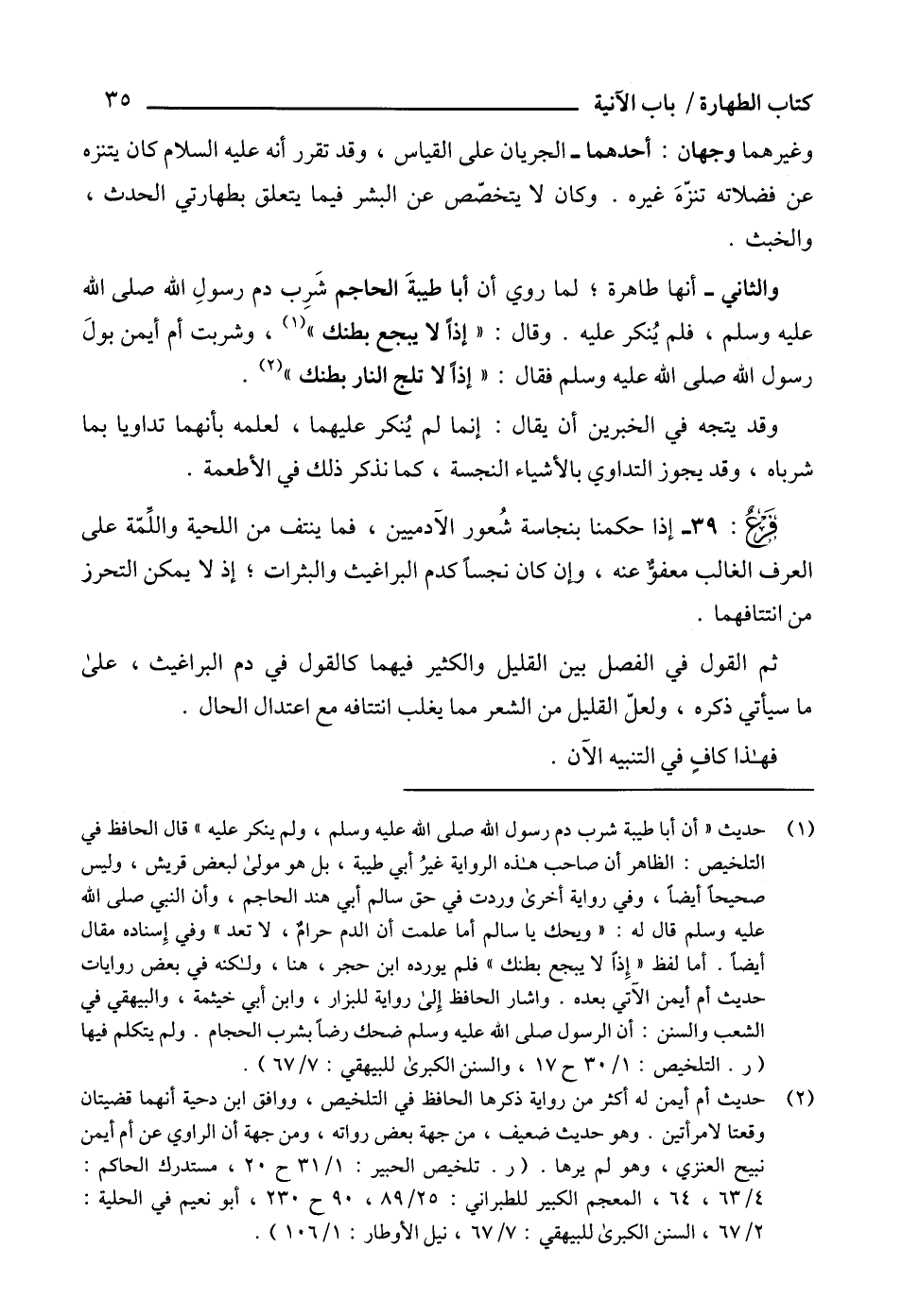 (¬1) حديث "أن أبا طيبة شرب دم رسول الله صلى الله عليه وسلم، ولم ينكر عليه" قال الحافظ في التلخيص: الظاهر أن صاحب هذه الرواية غيرُ أبي طيبة، بل هو مولى لبعض قريش، وليس صحيحاً أيضاً، وفي رواية أخرى وردت في حق سالم أبي هند الحاجم، وأن النبي صلى الله عليه وسلم قال له: " ويحك يا سالم أما علمت أن الدم حرامٌ، لا تعد " وفي إِسناده مقال أيضاً. أما لفظ " إِذاً لا يبجع بطنك " فلم يورده ابن حجر، هنا، ولكنه في بعض روايات حديث أم أيمن الآتي بعده. وأشار الحافظ إِلى رواية للبزار، وابن أبي خيثمة، والبيهقي في الشعب والسنن: أن الرسول صلى الله عليه وسلم ضحك رضاً بشرب الحجام. ولم يتكلم فيها (ر. التلخيص: 1/ 30 ح 17، والسنن الكبرى للبيهقي: 7/ 67).