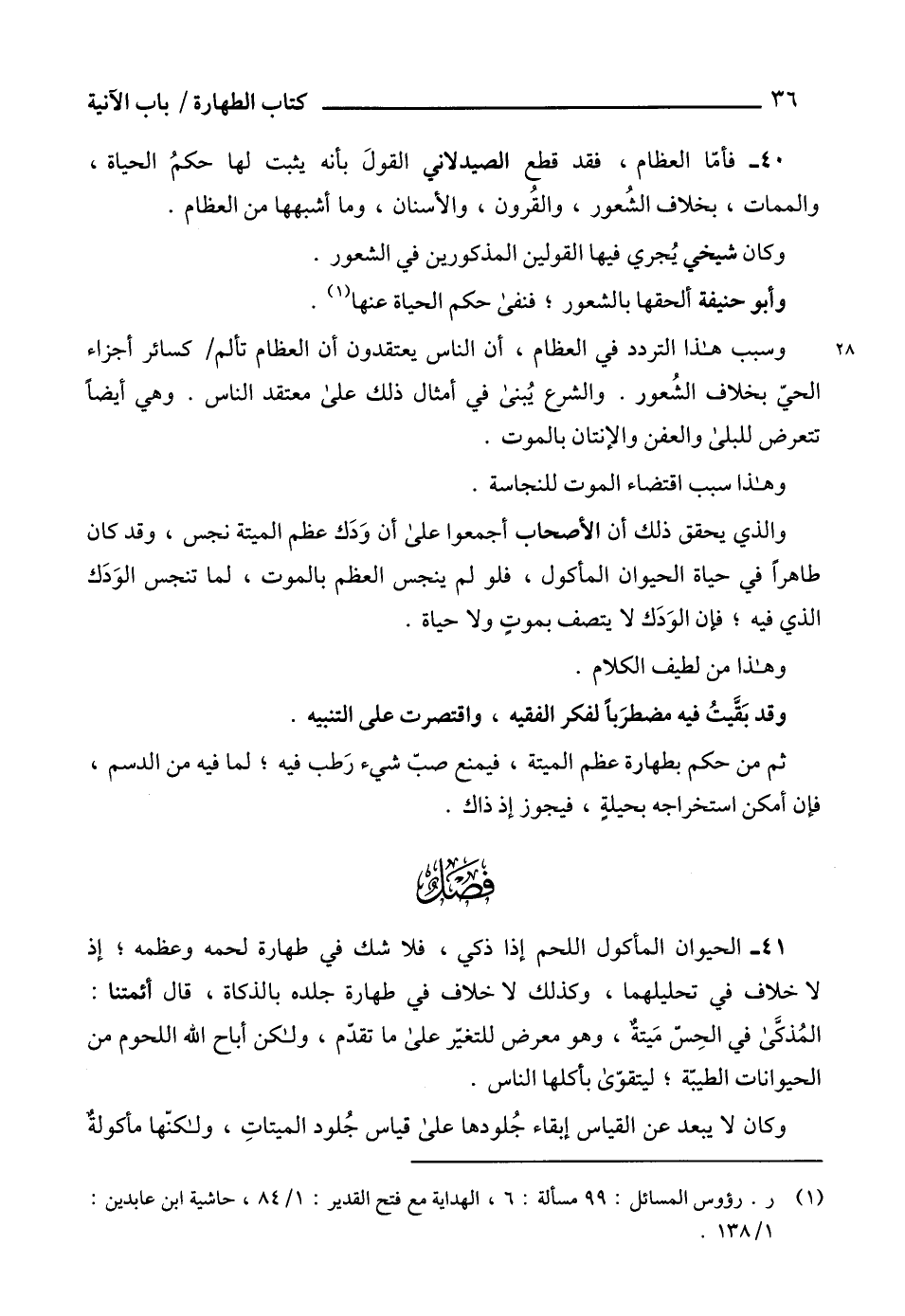 40 - فأمّا العظام، فقد قطع الصيدلاني القولَ بأنه يثبت لها حكمُ الحياة، والممات، بخلاف الشُعور، والقُرون، والأسنان، وما أشبهها من العظام.