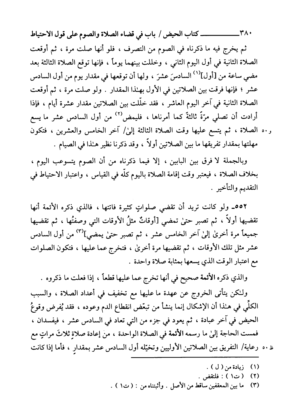 552 - ولو كانت تريد أن تقضي صلواتٍ كثيرة فاتتها، فالذي ذكره الأئمة أنها تقضيها أولاً، ثم تصبر حتى تمضي [أوقاتٌ مثلُ الأوقات التي وصفتُها، ثم تقضيها جميعاً مرة أخرى إلى آخر الخامس عشر، ثم تصبر حتى يمضي] (¬3) من أول السادس عشر مثل تلك الأوقات، ثم تقضيها مرة أخرى، فتخرج عما عليها، فتكون الصلوات مع اعتبار الوقت الذي يسعها بمثابة صلاة واحدة.
