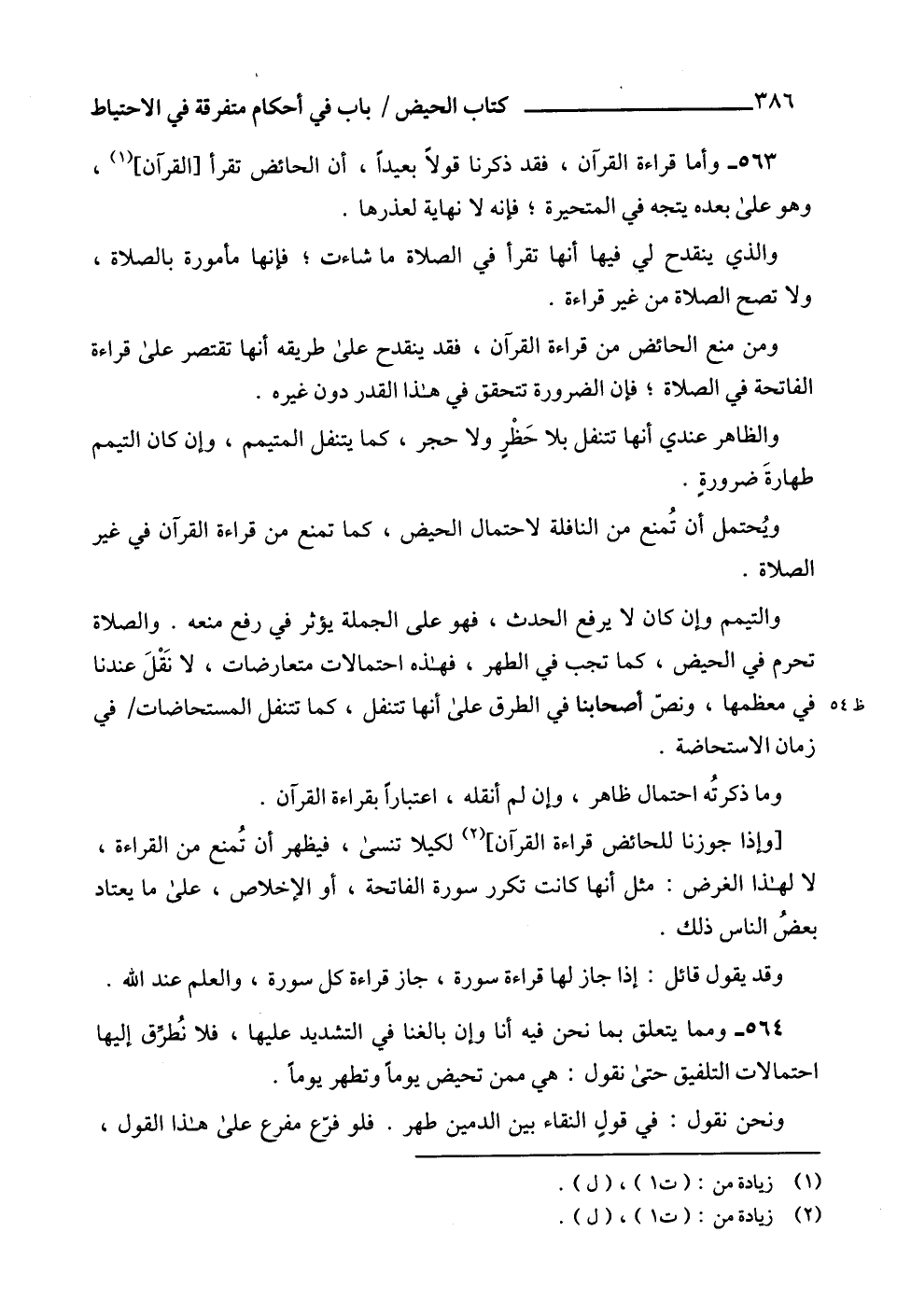 563 - وأما قراءة القرآن، فقد ذكرنا قولاً بعيداً، أن الحائض تقرأ [القرآن] (¬1)، وهو على بعده يتجه في المتحيرة؛ فإنه لا نهاية لعذرها.