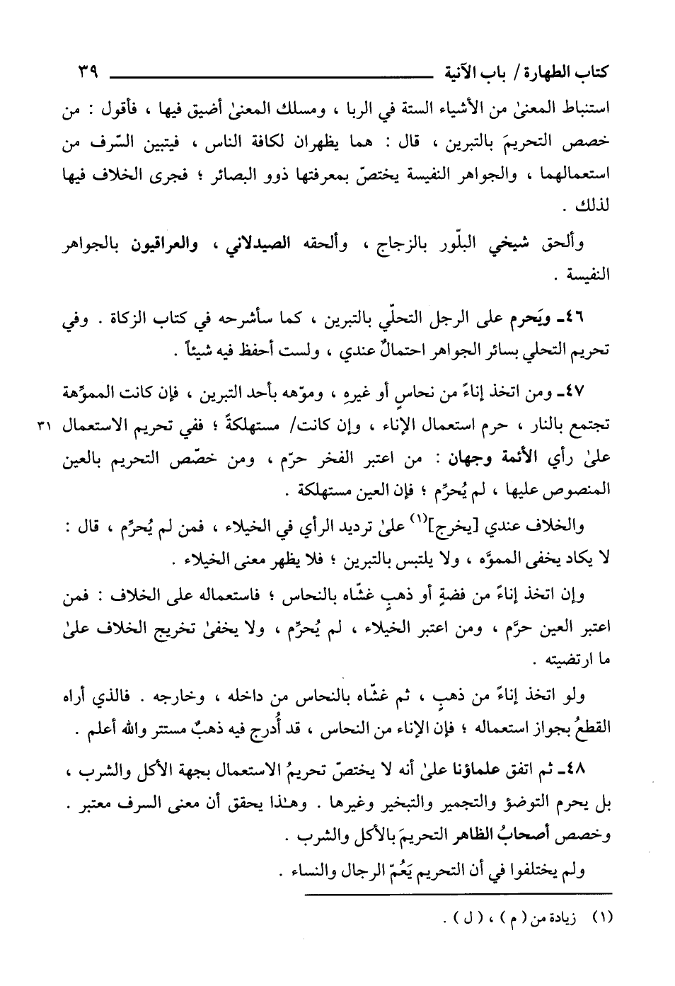 46 - وَيحرم على الرجل التحلّي بالتبرين، كما سأشرحه في كتاب الزكاة. وفي تحريم التحلي بسائر الجواهر احتمالٌ عندي، ولست أحفظ فيه شيئاً.