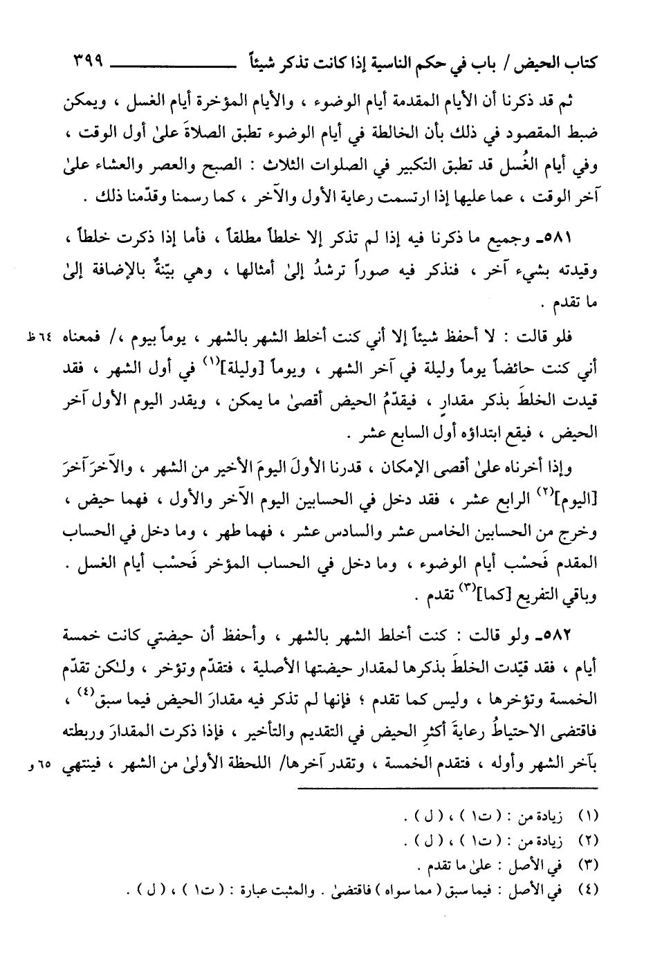 582 - ولو قالت: كنت أخلط الشهر بالشهر، وأحفظ أن حيضتي كانت خمسة أيام، فقد قيّدت الخلطَ بذكرها لمقدار حيضتها الأصلية، فتقدّم وتؤخر، ولكن تقدّم الخمسة وتؤخرها، وليس كما تقدم؛ فإنها لم تذكر فيه مقدارَ الحيض فيما سبق (¬4)، فاقتضى الاحتياطُ رعايةَ أكثرِ الحيض في التقديم والتأخير، فإذا ذكرت المقدارَ وربطته بآخر الشهر وأوله، فتقدم الخمسة، وتقدر آخرها اللحظة الأولى من الشهر، فينتهي