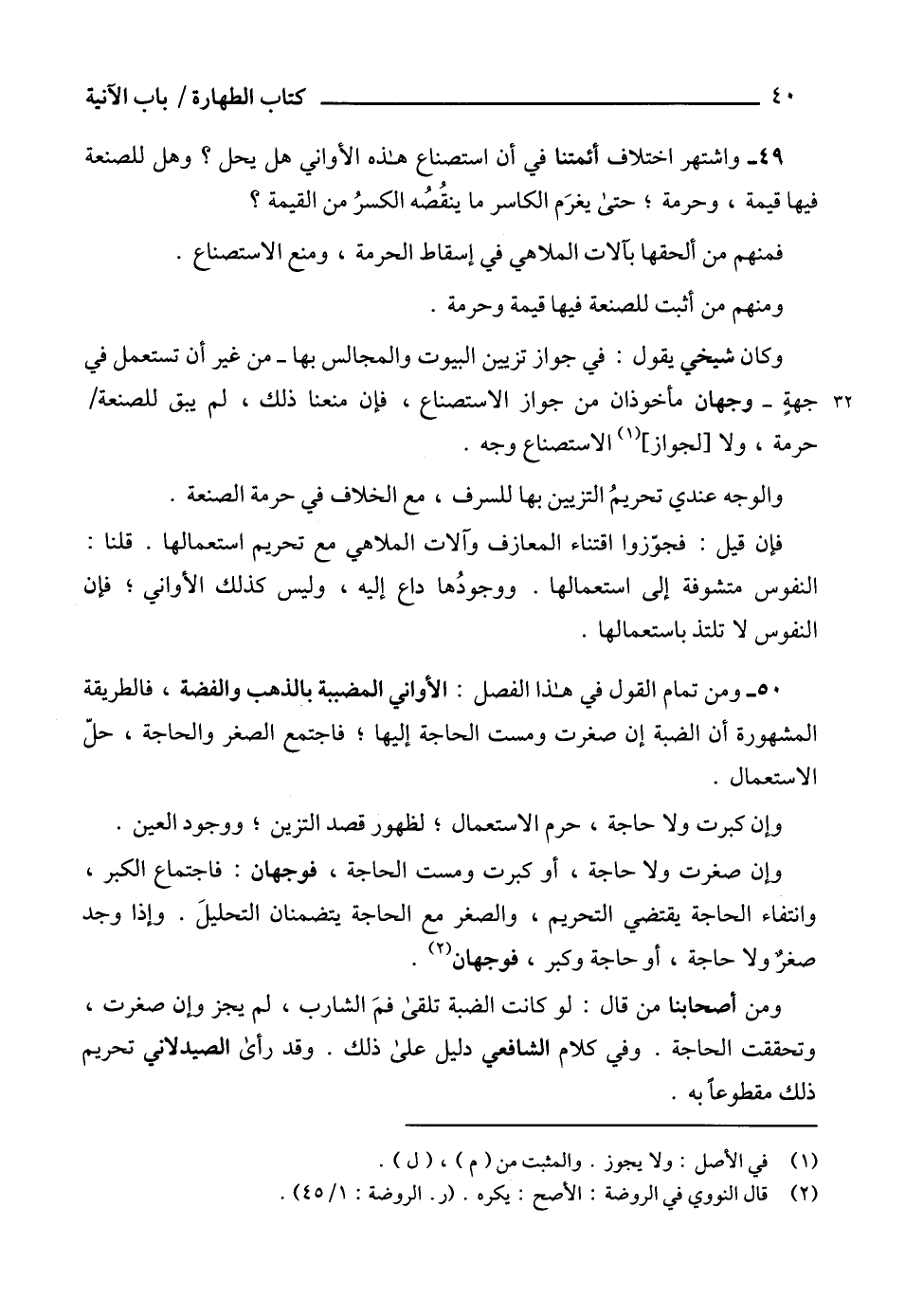49 - واشتهر اختلاف أئمتنا في أن استصناع هذه الأواني هل يحل؟ وهل للصنعة فيها قيمة، وحرمة؛ حتى يغرَم الكاسر ما ينقُصُه الكسرُ من القيمة؟