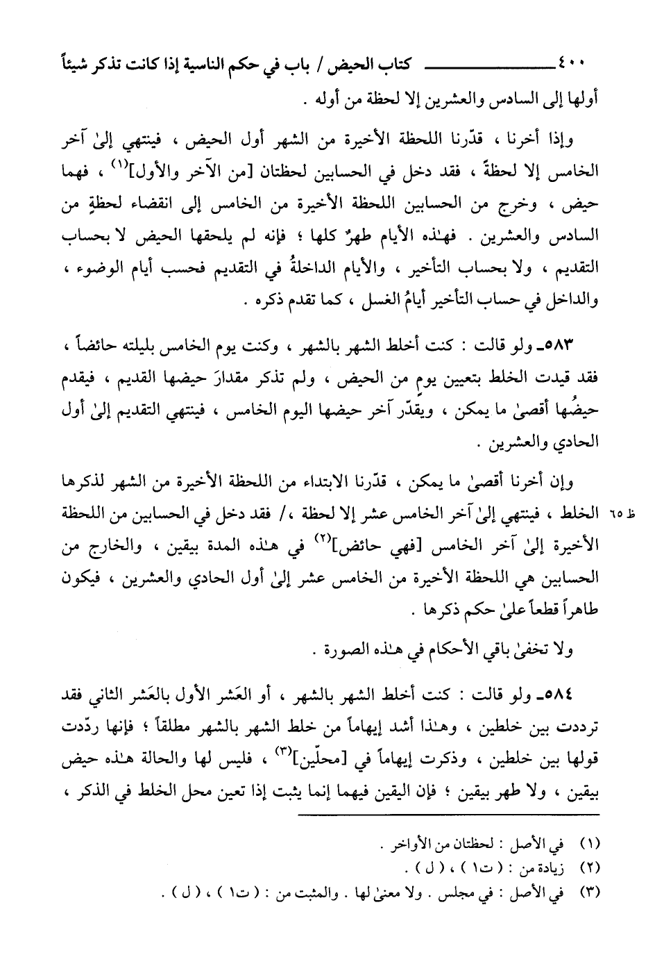 583 - ولو قالت: كنت أخلط الشهر بالشهر، وكنت يوم الخامس بليلته حائضاً، فقد قيدت الخلط بتعيين يومِ من الحيض، ولم تذكر مقدارَ حيضها القديم، فيقدم حيضُها أقصى ما يمكن، ويقدّر آخر حيضها اليوم الخامس، فينتهي التقديم إلى أول الحادي والعشرين.