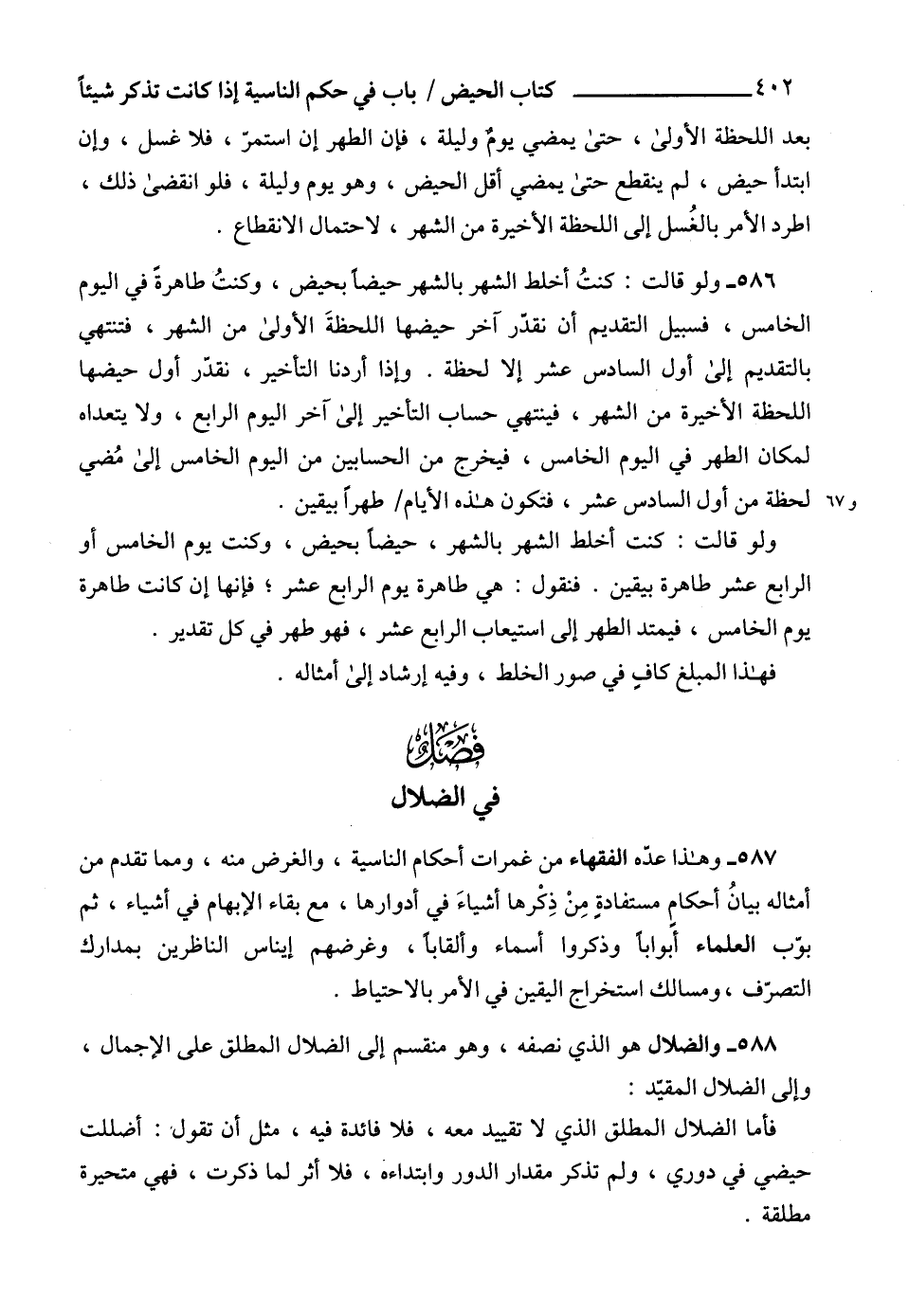 587 - وهذا عدّه الفقهاء من غمرات أحكام الناسية، والغرض منه، ومما تقدم من أمثاله بيانُ أحكامٍ مستفادةٍ مِنْ ذِكْرها أشياءَ في أدوارها، مع بقاء الإبهام في أشياء، ثم بوّب العلماء أبواباً وذكروا أسماء وألقاباً، وغرضهم إيناس الناظرين بمدارك التصرّف، ومسالك استخراج اليقين في الأمر بالاحتياط.