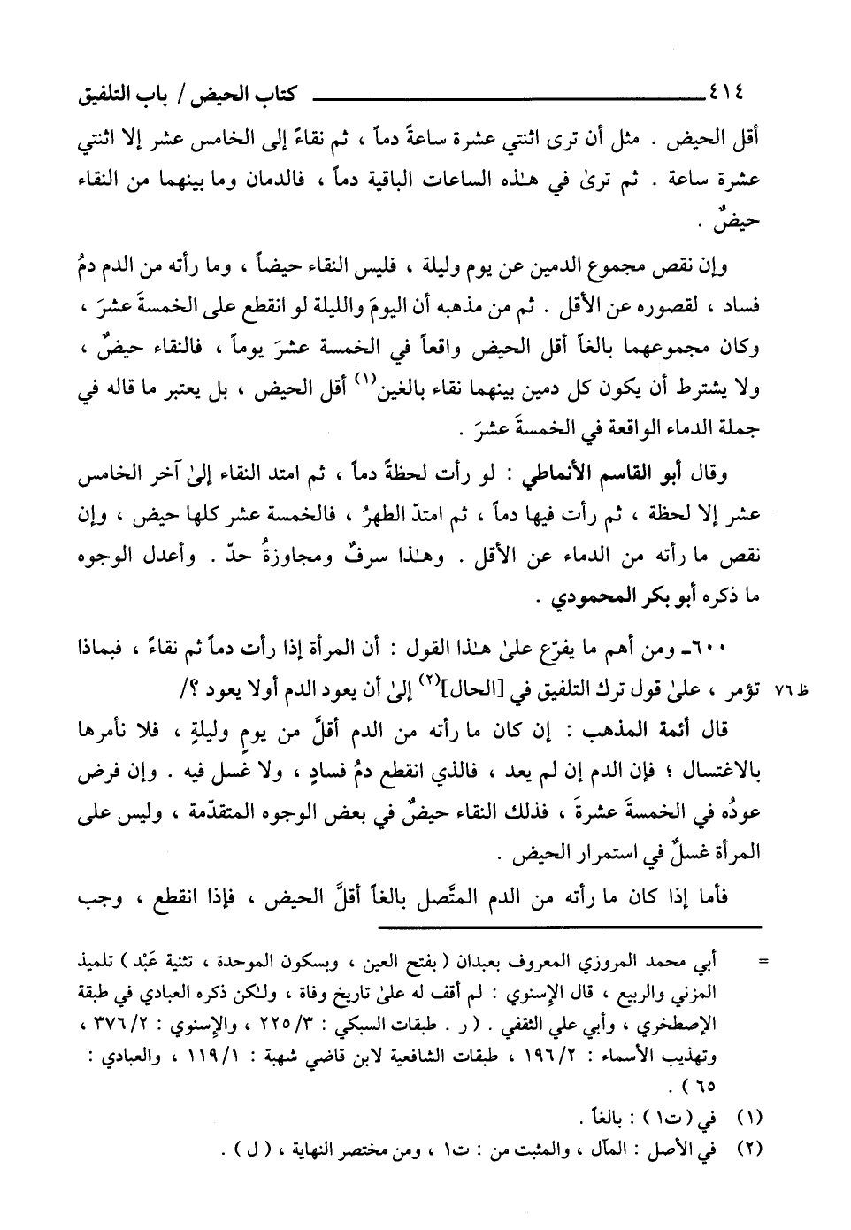 600 - ومن أهم ما يفرّع على هذا القول: أن المرأة إذا رأت دماًً ثم نقاءً، فبماذا تؤمر، على قول ترك التلفيق في [الحال] (¬2) إلى أن يعود الدم أو لا يعود؟
