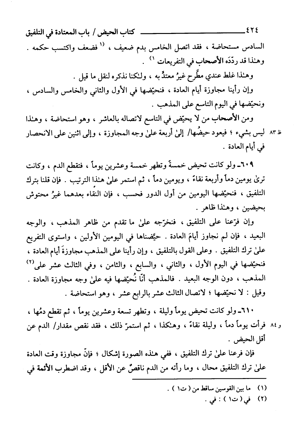 609 - ولو كانت تحيض خمسةً وتطهر خمسة وعشرين يوماًً، فتقطع الدم، وكانت ترى يومين دماًً وأربعة نقاءً، ويومين دماً، ثم استمر على هذا الترتيب. فإن قلنا بترك التلفيق، فنحيّضها اليومين من أول الدور فحسب، فإن النقاء بعدهما غيرُ محتوش بحيضين، وهذا ظاهر.