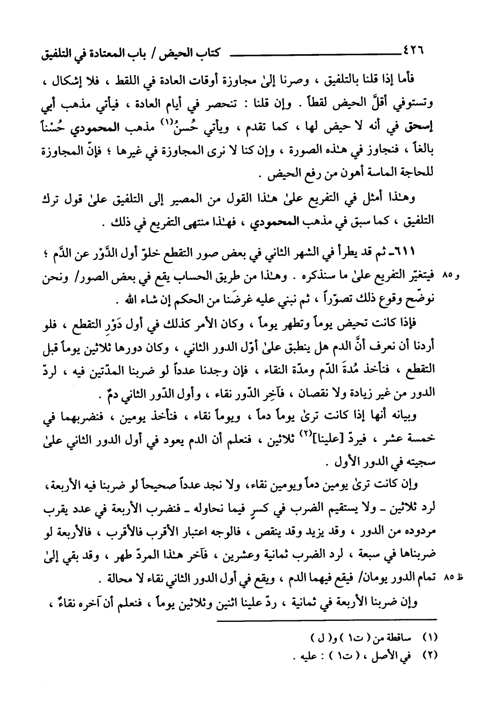 611 - ثم قد يطرأ في الشهر الثاني في بعض صور التقطع خلوّ أول الدَّوْر عن الدَّم؛ فيتغيّر التفريع على ما سنذكره. وهذا من طريق الحساب يقع في بعض الصور ونحن نوضّح وقوع ذلك تصوّراً، ثم نبني عليه غرضَنا من الحكم إن شاء الله.