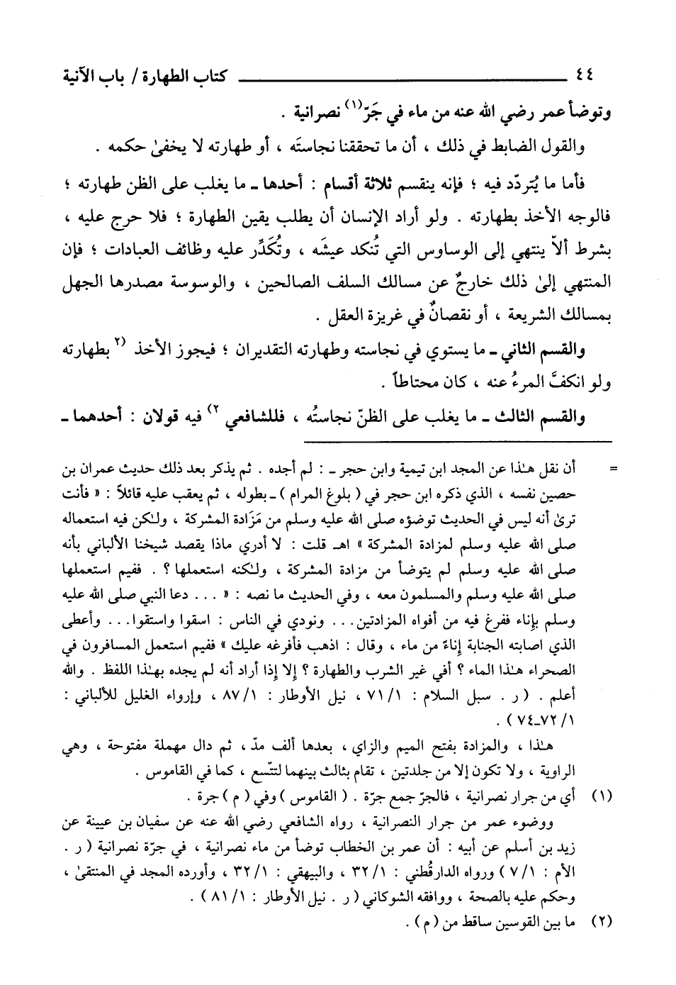 = أن نقل هذا عن المجد ابن تيمية وابن حجر-: لم أجده. ثم يذكر بعد ذلك حديث عمران بن حصين نفسه، الذي ذكره ابن حجر في (بلوغ المرام) - بطوله، ثم يعقب عليه قائلاً: "فأنت ترى أنه ليس في الحديث توضؤه صلى الله عليه وسلم من مَزَادة المشركة، ولكن فيه استعماله صلى الله عليه وسلم لمزادة المشركة " اهـ قلت: لا أدري ماذا يقصد شيخنا الألباني بأنه صلى الله عليه وسلم لم يتوضأ من مزادة المشركة، ولكنه استعملها؟. ففيم استعملها صلى الله عليه وسلم والمسلمون معه، وفي الحديث ما نصه: " ... دعا النبي صلى الله عليه وسلم بإِناء ففرغ فيه من أفواه المزادتين ... ونودي في الناس: اسقوا واستقوا ... وأعطى الذي اصابته الجنابة إِناءً من ماء، وقال: اذهب فأفرغه عليك" ففيم استعمل المسافرون في الصحراء هذا الماء؟ أفي غير الشرب والطهارة؟ إِلا إِذا أراد أنه لم يجده بهذا اللفظ. والله أعلم. (ر. سبل السلام: 1/ 71، نيل الأوطار: 1/ 87، وإرواء الغليل للألباني: 1/ 72 - 74).