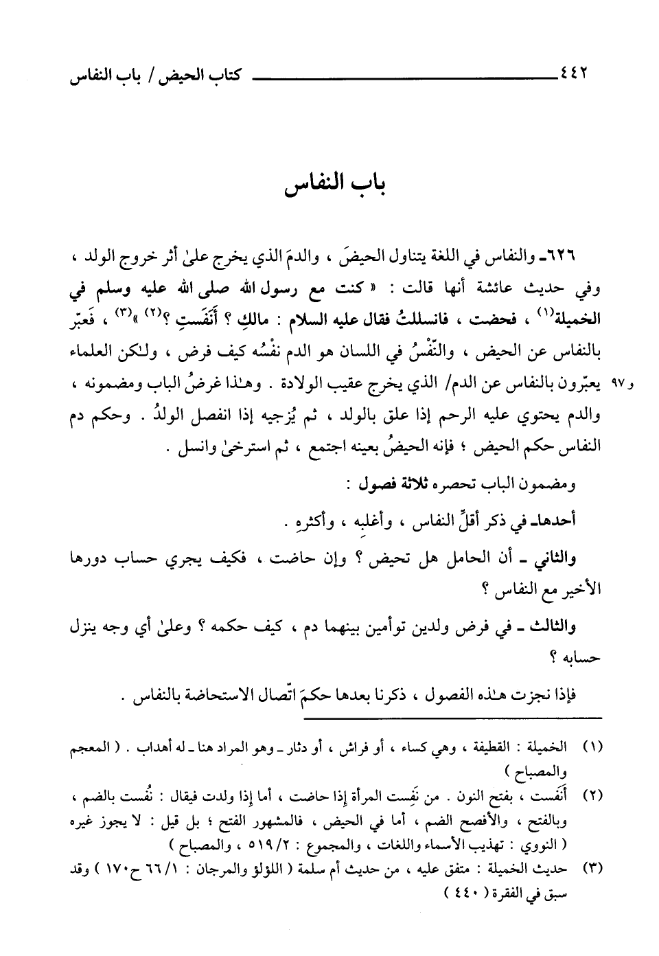 (¬2) أَنَفست، بفتح النون. من نَفِست المرأة إِذا حاضت، أما إِذا ولدت فيقال: نُفست بالضم، وبالفتح، والأفصح الضم، أما في الحيض، فالمشهور الفتح؛ بل قيل: لا يجوز غيره (النووي: تهذيب الأسماء واللغات، والمجموع: 2/ 519، والمصباح)