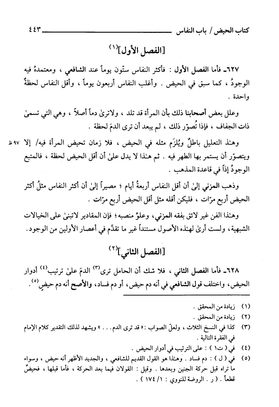 627 - فأما الفصل الأول: فأكثر النفاس ستّون يوم عند الشافعي، ومعتمدهُ فيه الوجودُ، كما سبق في الحيض. وأغلب النفاس أربعون يوماًً، وأقل النفاس لحظةٌ واحدة.