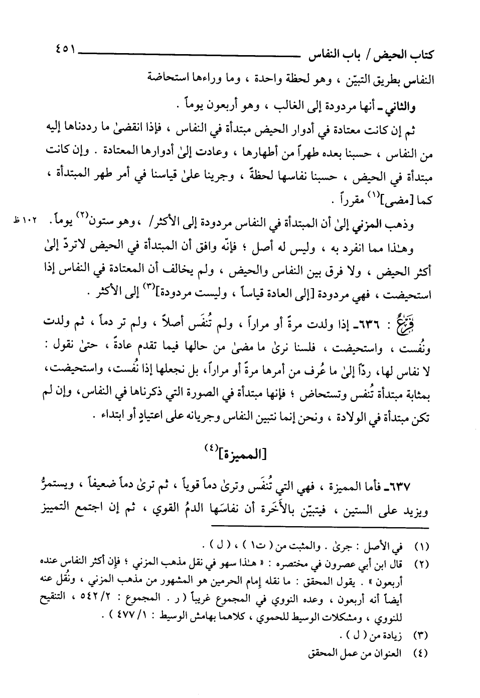 (¬2) قال ابن أبي عصرون في مختصره: "هذا سهو في نقل مذهب المزني؛ فإِن أكثر النفاس عنده أربعون". يقول المحقق: ما نقله إِمام الحرمين هو المشهور من مذهب المزني، ونُقل عنه أيضاً أنه أربعون، وعده النووي في المجموع غريباً (ر. المجموع: 2/ 542، التنقيح للنووي، ومشكلات الوسيط للحموي، كلاهما بهامش الوسيط: 1/ 477).