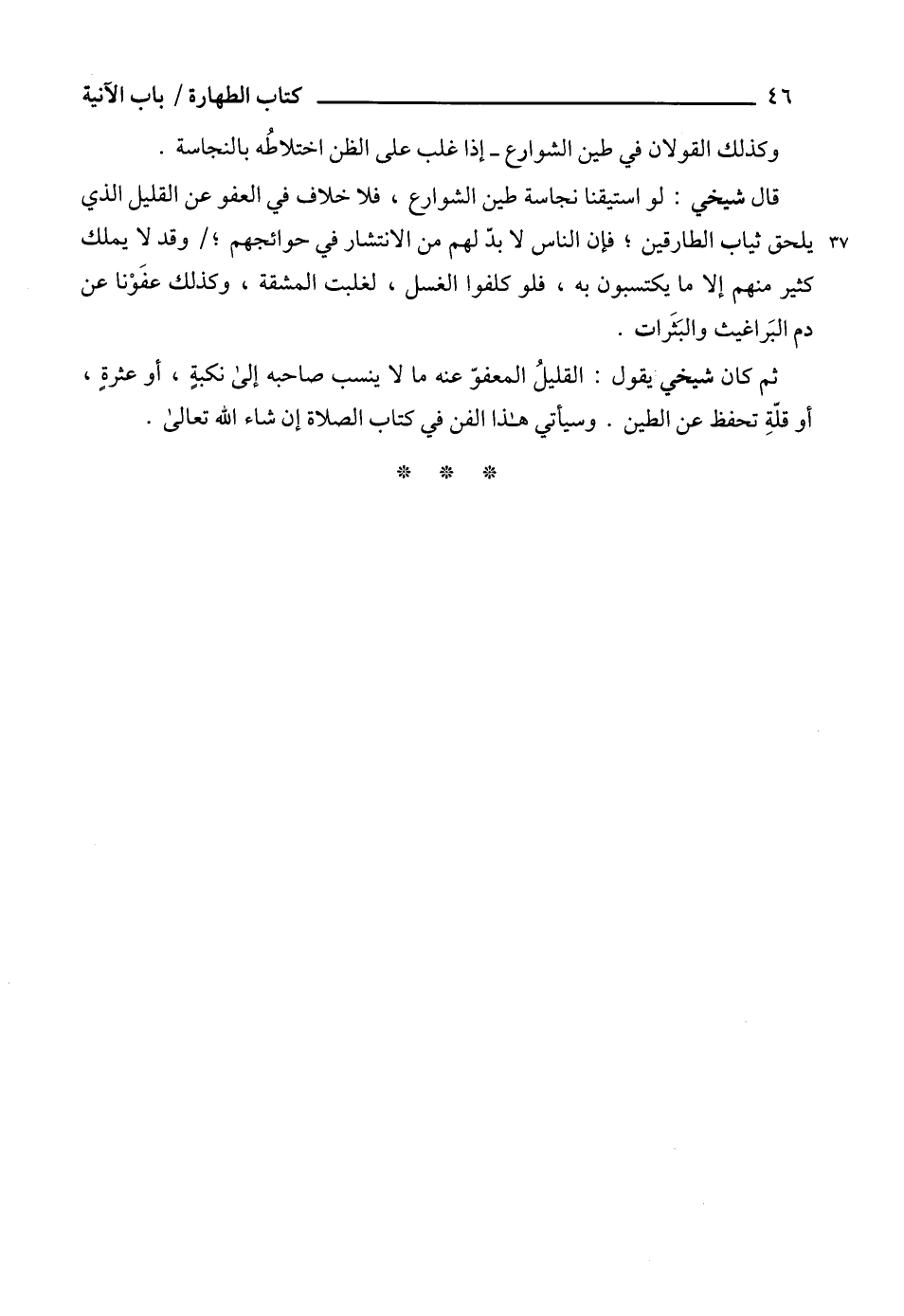 ثم كان شيخي يقول: القليلُ المعفوّ عنه ما لا ينسب صاحبه إلى نكبةٍ، أو عثرةٍ، أو قلّةِ تحفظ عن الطين. وسيأتي هذا الفن في كتاب الصلاة إن شاء الله تعالى.