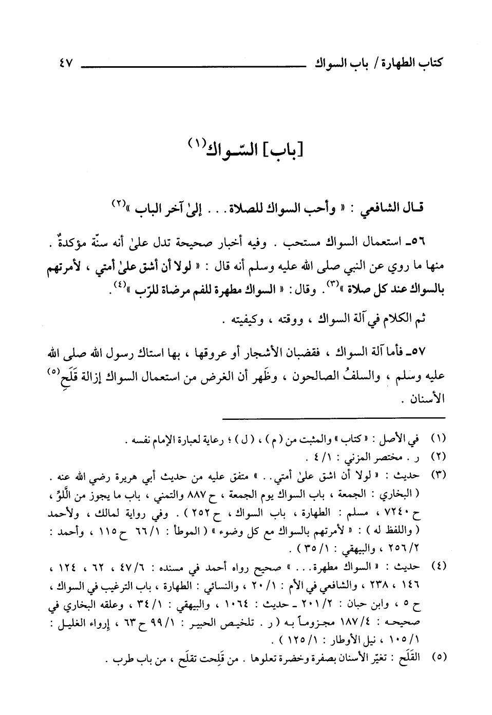 56 - استعمال السواك مستحب. وفيه أخبار صحيحة تدل على أنه سنّة مؤكدةٌ.