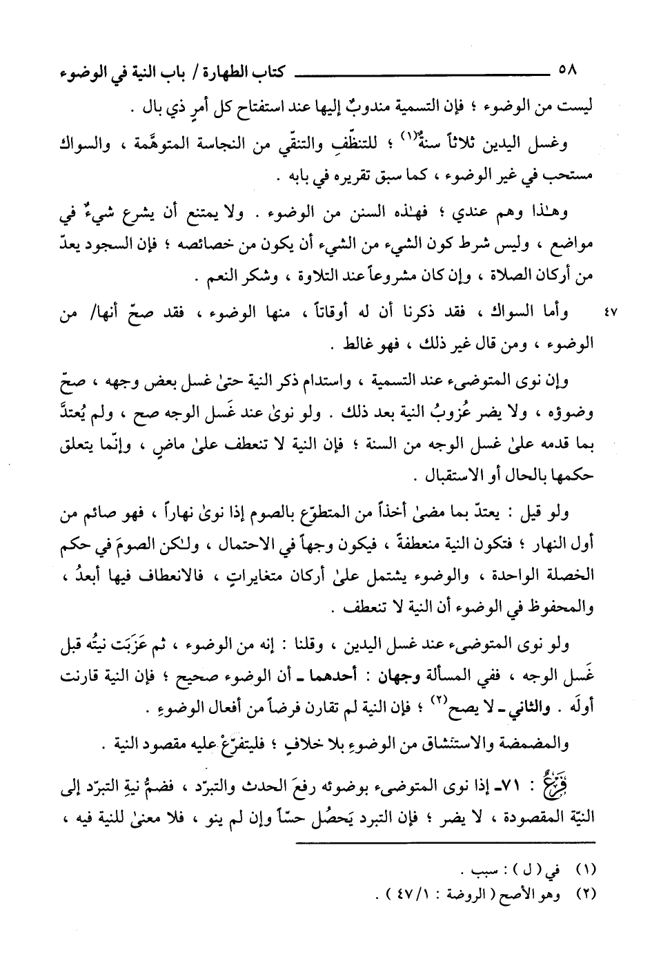 71 - إذا نوى المتوضىء بوضوئه رفعَ الحدث والتبرّد، فضمُّ نيةِ التبرّد إلى النيّة المقصودة، لا يضر؛ فإن التبرد يَحصُل حسّاً وإن لم ينو، فلا معنى للنية فيه،