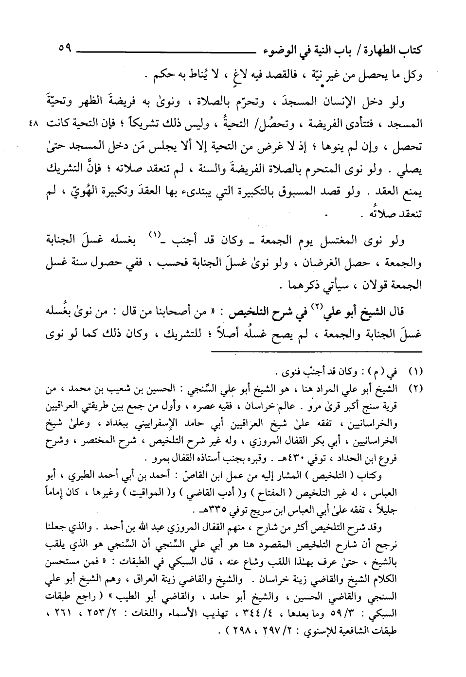 (¬2) الشيخ أبو علي المراد هنا، هو الشيخ أبو علي السِّنجي: الحسين بن شعيب بن محمد، من قرية سنج أكبر قرى مرو. عالم خراسان، فقيه عصره، وأول من جمع بين طريقتي العراقيين والخراسانيين، تفقه على شيخ العراقيين أبي حامد الإِسفراييني ببغداد، وعلى شيخ الخراسانيين، أبي بكر القفال المروزي، وله غير شرح التلخيص، شرح المختصر، وشرح فروع ابن الحداد، توفي 430 هـ. وقبره بجنب أستاذه القفال بمرو.