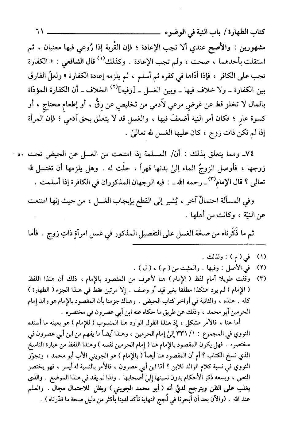 (¬3) وقفت طويلاً أمام لفظ (الإِمام) هنا لأعرف من المقصود بالإِمام، ذلك أن هذا اللفظ (الإِمام) لم يرد هكذا مطلقاً بغير قيد أو وصف. إِلا مرتين فقط في هذا الجزء (الطهارة) كله. هذه، والثانية في أواخر كتاب الحيض. وهناك جزمنا بأن المقصود بالإِمام هو والد إِمام الحرمين أبو محمد، وذلك عن طريق ما حكاه عنه ابن أبي عصرون في مختصره.