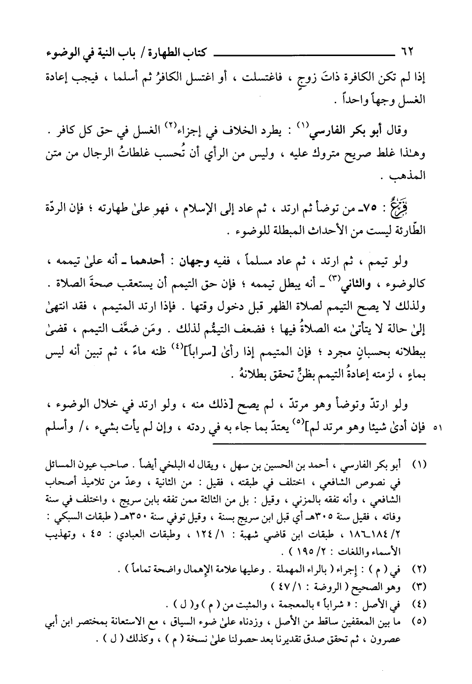 (¬1) أبو بكر الفارسي، أحمد بن الحسين بن سهل، ويقال له البلخي أيضاً. صاحب عيون المسائل في نصوص الشافعي، اختلف في طبقته، فقيل: من الثانية، وعدّ من تلاميذ أصحاب الشافعي، وأنه تفقه بالمزني، وقيل: بل من الثالثة ممن تفقه بابن سريج، واختلف في سنة وفاته، فقيل سنة 305 هـ أي قبل ابن سريج بسنة، وقيل توفي سنة 350 هـ (طبقات السبكي: 2/ 184 - 186، طبقات ابن قاضي شهبة: 1/ 124، وطبقات العبادي: 45، وتهذيب الأسماء واللغات: 2/ 195).