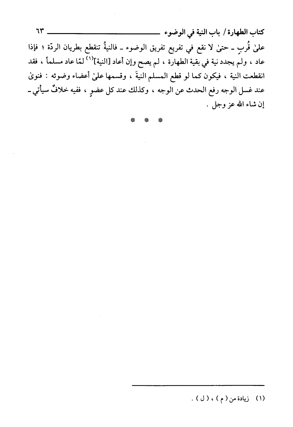 على قُربٍ -حتى لا نقع في تفريع تفريق الوضوء- فالنيةُ تنقطع بطريان الردّة؛ فإذا عاد، ولم يجدد نية في بقية الطهارة، لم يصح وإن أعاد [النية] (¬1) لمّا عاد مسلماً، فقد انقطعت النية، فيكون كما لو قطع المسلم النيةَ، وقسمها على أعضاء وضوئه: فنوى عند غسل الوجه رفع الحدث عن الوجه، وكذلك عند كل عضوٍ، ففيه خلافٌ سيأتي - إن شاء الله عز وجل.