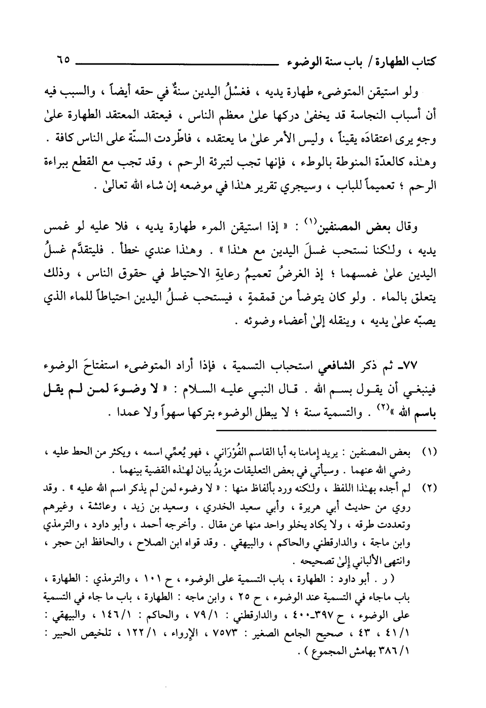 77 - ثم ذكر الشافعي استحباب التسمية، فإذا أراد المتوضىء استفتاحَ الوضوء فينبغي أن يقول بسم الله. قال النبي عليه السلام: " لا وضوءَ لمن لم يقل باسم الله " (¬2). والتسمية سنة؛ لا يبطل الوضوء بتركها سهواً ولا عمدا.