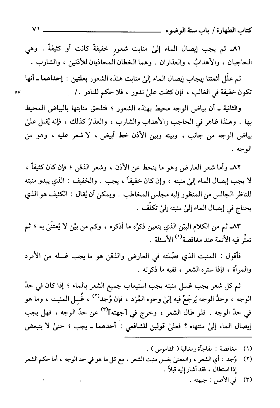 81 - ثم يجب إيصال الماء إلى منابت شعورٍ خفيفةً كانت أو كثيفةً. وهي الحاجبان، والأهدابُ، والعذاران. وهما الخطان المحاذيان للأذنين، والشارب.
