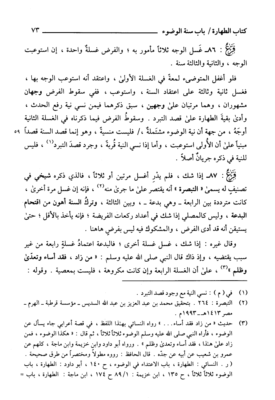 86 - غَسل الوجه ثلاثاًً مأمور به؛ والفرض غسلةٌ واحدة، إن استوعبت الوجه، والثانية والثالثة سنة.