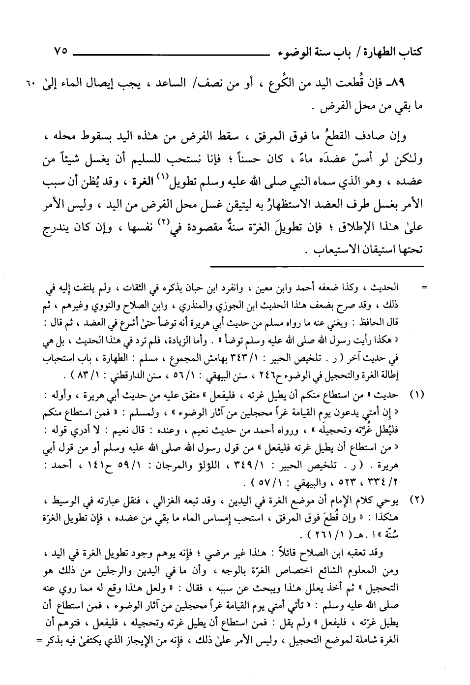 (¬1) حديث "من استطاع منكم أن يطيل غرته، فليفعل" متفق عليه من حديث أبي هريرة، وأوله: "إِن أمتي يدعون يوم القيامة غراً محجلين من آثار الوضوء" ولمسلم: "فمن استطاع منكم فليُطل غُرته وتحجيلَه"، ورواه أحمد من حديث نعيم، وعنده: قال نعيم: لا أدري قوله: "من استطاع أن يطيل غرته فليفعل" من قول رسول الله صلى الله عليه وسلم أو من قول أبي هريرة. (ر. تلخيص الحبير: 1/ 349، اللؤلؤ والمرجان: 1/ 59 ح 141، أحمد: 2/ 334، 523، والبيهقي: 1/ 57).