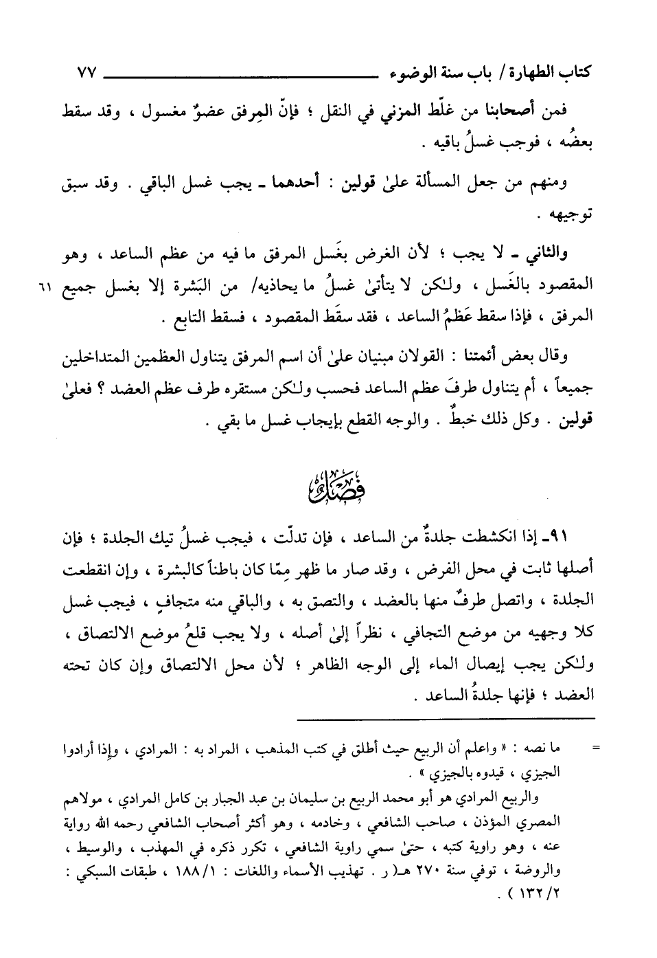 91 - إذا انكشطت جلدةٌ من الساعد، فإن تدلّت، فيجب غسلُ تيك الجلدة؛ فإن أصلها ثابت في محل الفرض، وقد صار ما ظهر مِمّا كان باطناً كالبشرة، وإن انقطعت الجلدة، واتصل طرفٌ منها بالعضد، والتصق به، والباقي منه متجافٍ، فيجب غسل كلا وجهيه من موضع التجافي، نظراً إلى أصله، ولا يجب قلعُ موضع الالتصاق، ولكن يجب إيصال الماء إلى الوجه الظاهر؛ لأن محل الالتصاق وإن كان تحته العضد؛ فإنها جلدةُ الساعد.