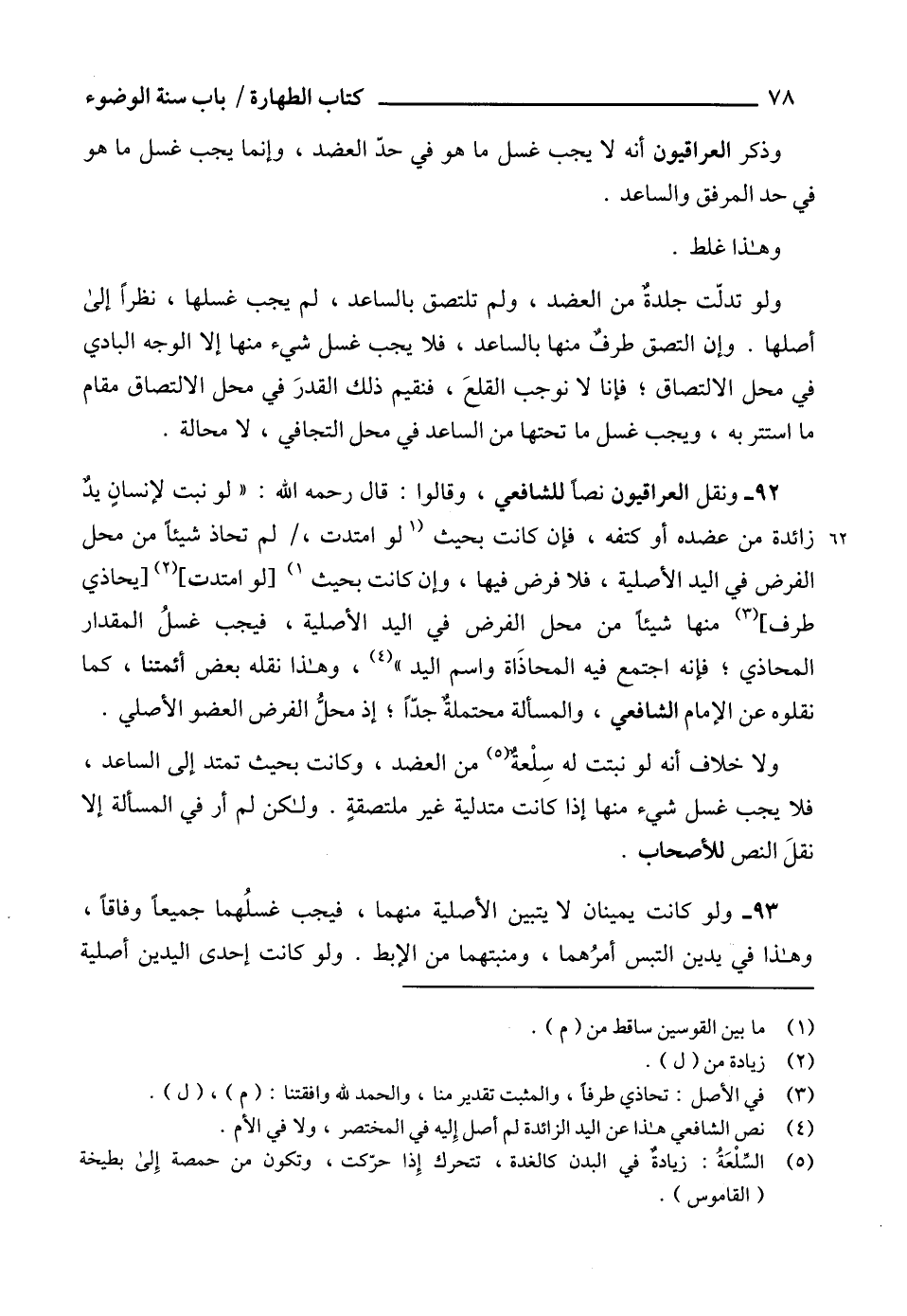 وذكر العراقيون أنه لا يجب غسل ما هو في حدّ العضد، وإنما يجب غسل ما هو في حد المرفق والساعد.