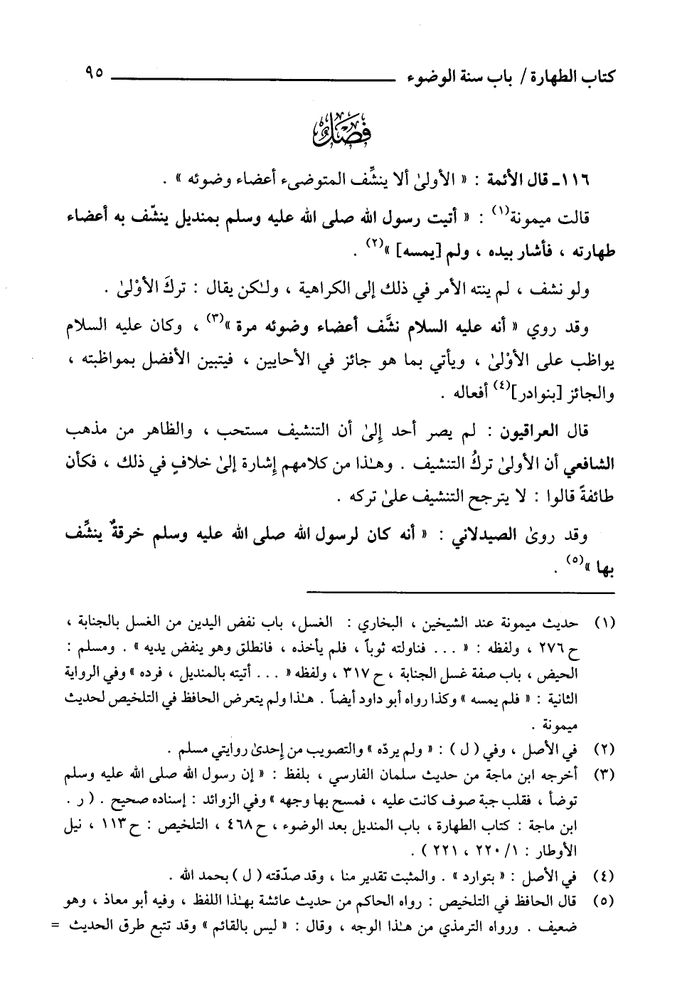 116 - قال الأئمة: " الأولى ألا ينشِّف المتوضىء أعضاء وضوئه ".