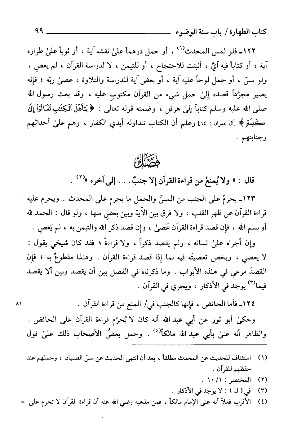 122 - فلو لمس المحدث (¬1)، أو حمل درهماً على نقشه آية، أو ثوباً على طرازه آية، أو كتاباً فيه آيٌ، أثبتت للاحتجاج، أو للتيمن، لا لدراسة القرآن، لم يعصِ، ولو مسّ، أو حمل لوحاً عليه آية، أو بعض آية للدراسة والتلاوة، عصى ربّه؛ فإِنه يصير مجرِّداً قصده إِلى حمل شيء من القرآن مكتوبٍ عليه، وقد بعث رسول الله صلى الله عليه وسلم كتاباً إلى هرقل، وضمنه قوله تعالى: {يَا أَهْلَ الْكِتَابِ تَعَالَوْا إِلَى كَلِمَةٍ سَوَاءٍ بَيْنَنَا وَبَيْنَكُمْ} [آل عمران: 64] وعلم أنْ الكتاب تتداوله أيدي الكفار، وهم على أحداثهم وجنابتهم.