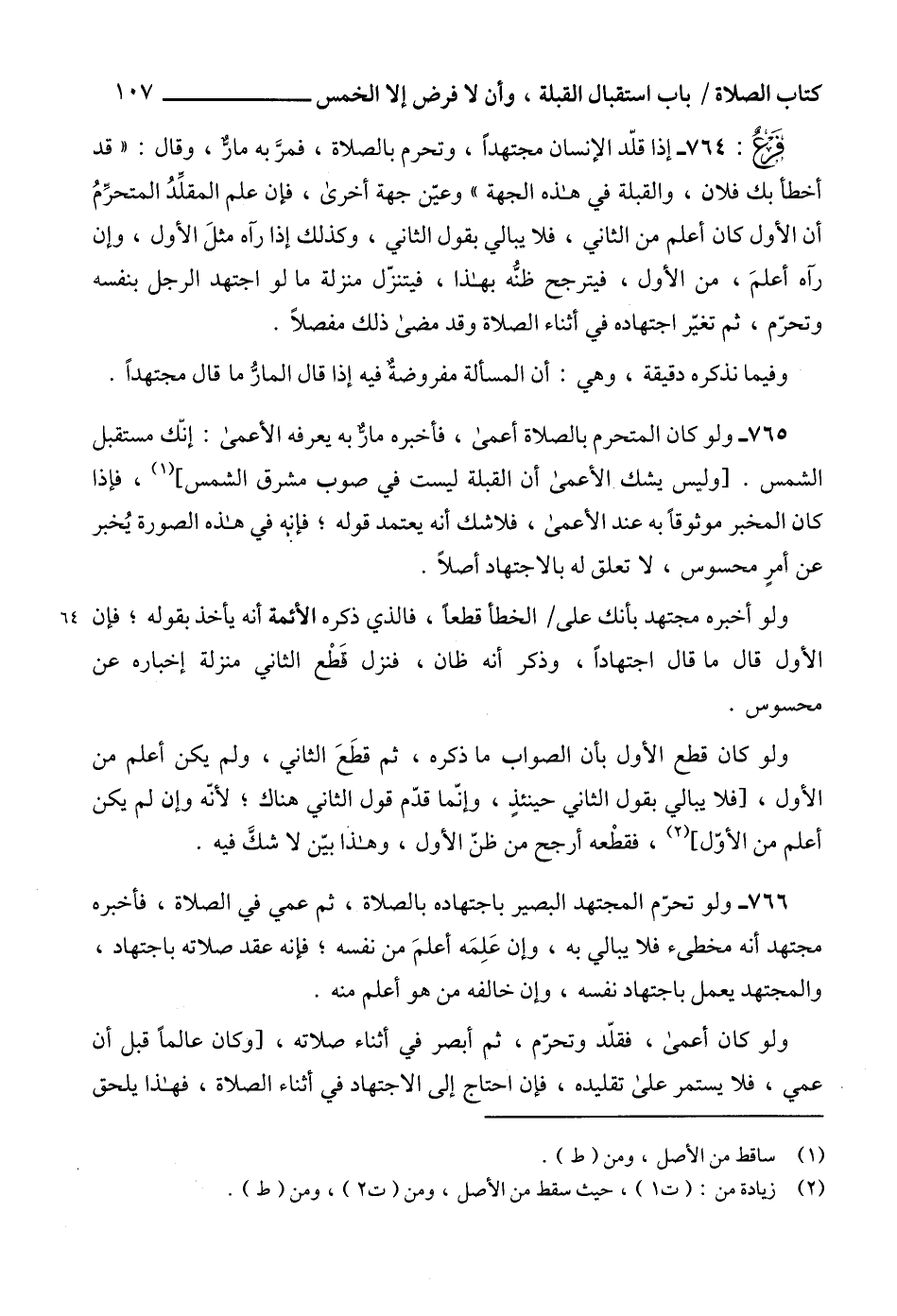 766 - ولو تحرّم المجتهد البصير باجتهاده بالصلاة، ثم عمي في الصلاة، فأخبره مجتهد أنه مخطىء فلا يبالي به، وإن عَلِمَه أعلمَ من نفسه؛ فإنه عقد صلاته باجتهاد، والمجتهد يعمل باجتهاد نفسه، وإن خالفه من هو أعلم منه.