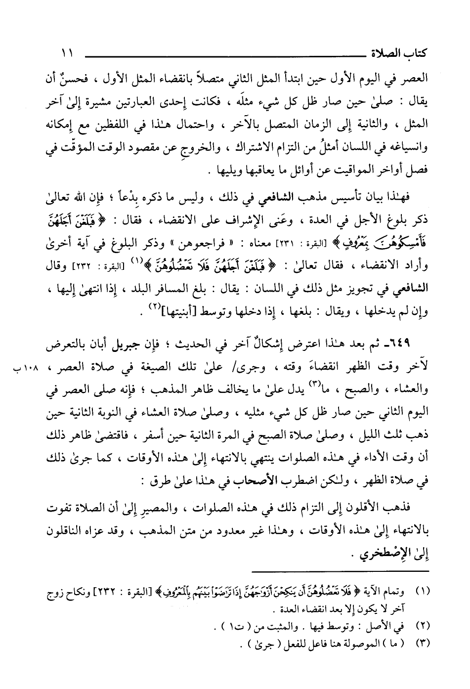 649 - ثم بعد هذا اعترض إِشكالٌ آخر في الحديث، فإِن جبريل أبان بالتعرض لآخر وقت الظهر انقضاءَ وقته، وجرى على تلك الصيغة في صلاة العصر، والعشاء، والصبح، ما (¬3) يدل على ما يخالف ظاهر المذهب؛ فإِنه صلى العصر في اليوم الثاني حين صار ظل كل شيء مثليه، وصلى صلاة العشاء في النوبة الثانية حين ذهب ثلث الليل، وصلى صلاة الصبح في المرة الثانية حين أسفر، فاقتضى ظاهر ذلك أن وقت الأداء في هذه الصلوات ينتهي بالانتهاء إِلى هذه الأوقات، كما جرى ذلك في صلاة الظهر، ولكن اضطرب الأصحاب في هذا على طرق: