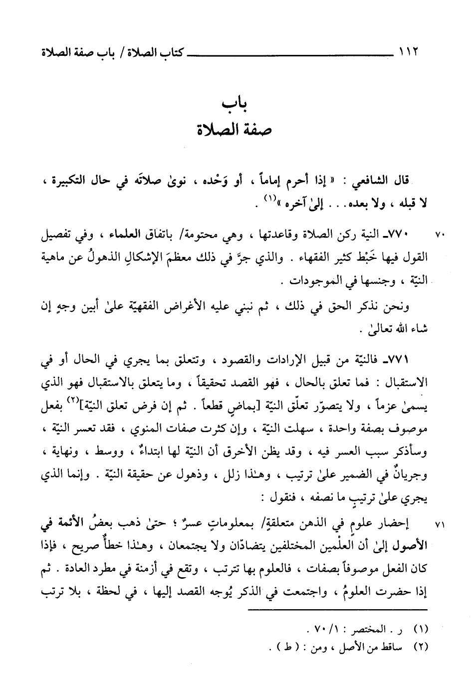 770 - النية ركن الصلاة وقاعدتها، وهي محتومة باتفاق العلماء، وفي تفصيل القول فيها خَبْط كثير الفقهاء. والذي جر في ذلك معظمَ الإشكالِ الذهولُ عن ماهية النيّة، وجنسها في الموجودات.