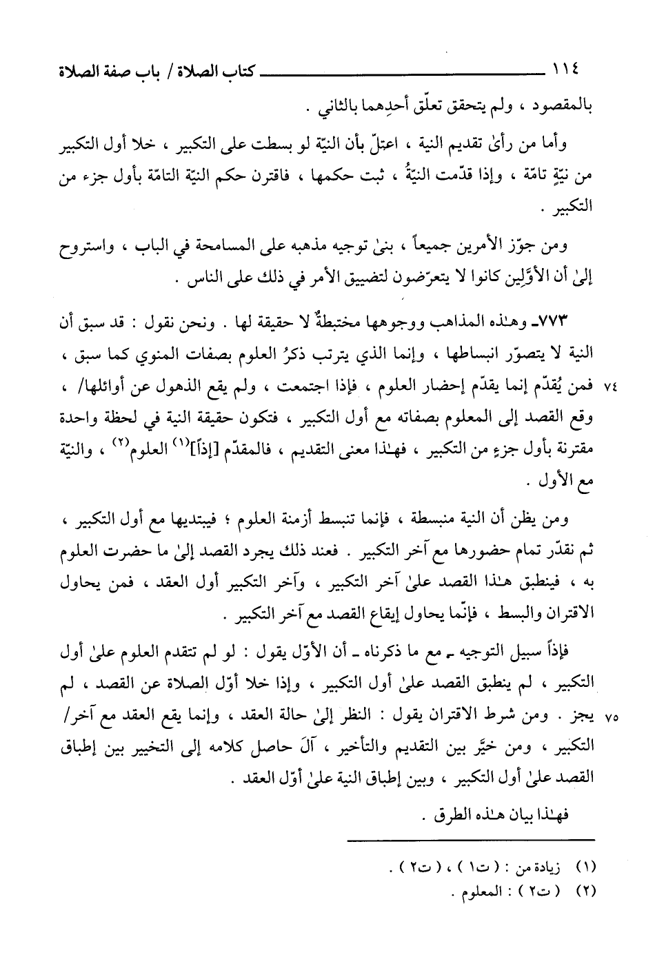 773 - وهذه المذاهب ووجوهها مختبطة لا حقيقة لها. ونحن نقول: قد سبق أن النية لا يتصوّر انبساطها، وإنما الذي يترتب ذكرُ العلوم بصفات المنوي كما سبق، فمن يُقدّم إنما يقدّم إحضار العلوم، فإذا اجتمعت، ولم يقع الذهول عن أوائلها، وقع القصد إلى المعلوم بصفاته مع أول التكبير، فتكون حقيقة النية في لحظة واحدة مقترنة بأول جزءٍ من التكبير، فهذا معنى التقديم، فالمقدّم [إذاً] (¬1) العلوم (¬2)، والنيّة مع الأول.
