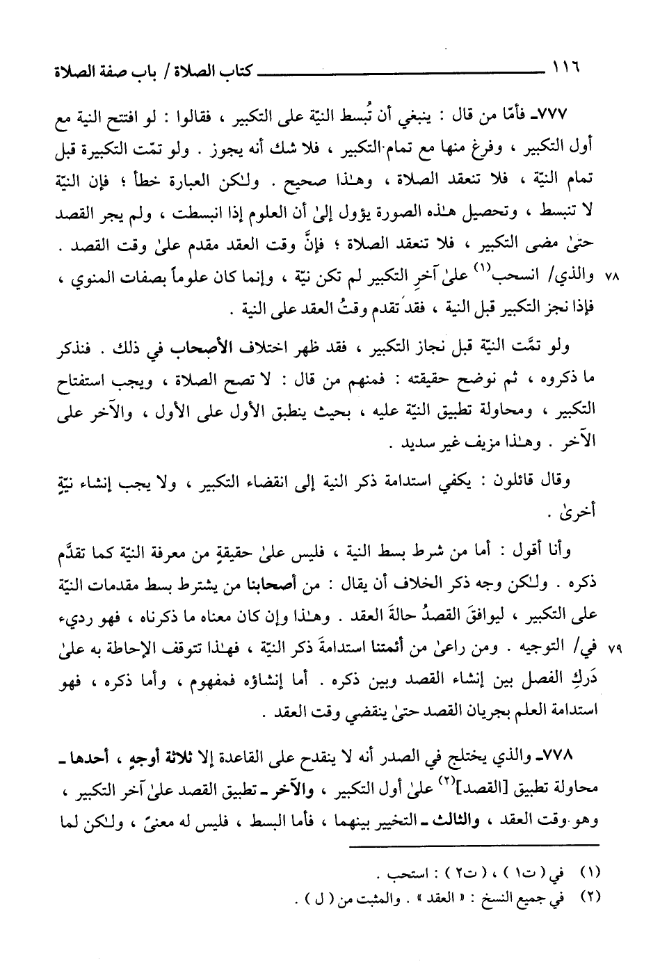 777 - فأمّا من قال: ينبغي أن تُبسط النيّة على التكبير، فقالوا: لو افتتح النية مع أول التكبير، وفرغ منها مع تمام. التكبير، فلا شك أنه يجوز. ولو تمّت التكبيرة قبل تمام النيّة، فلا تنعقد الصلاة، وهذا صحيح. ولكن العبارة خطأ؛ فإن النيّة لا تنبسط، وتحصيل هذه الصورة يؤول إلى أن العلوم إذا انبسطت، ولم يجر القصد حتى مضى التكبير، فلا تنعقد الصلاة؛ فإنَّ وقت العقد مقدم على وقت القصد.