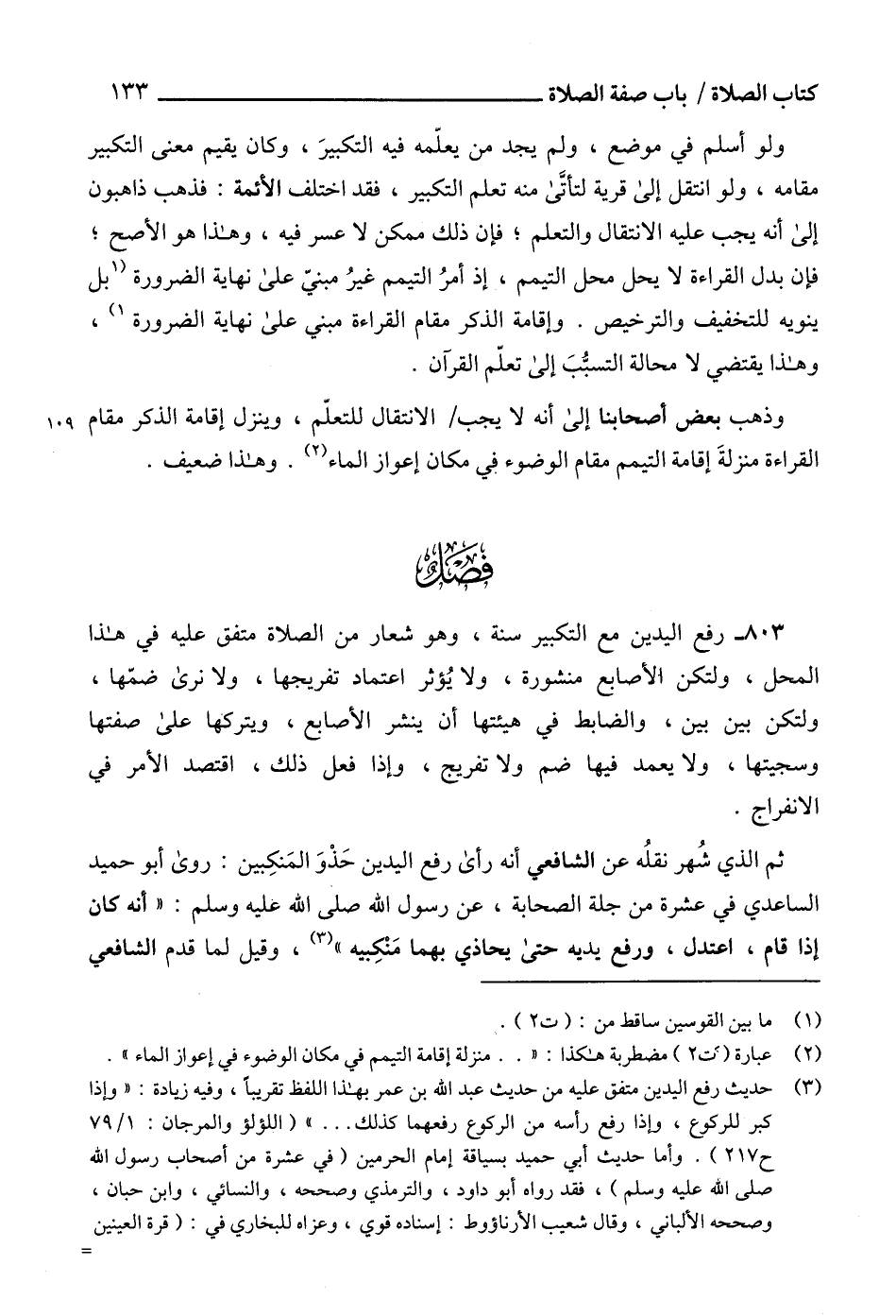 803 - رفع اليدين مع التكبير سنة، وهو شعار من الصلاة متفق عليه في هذا المحل، ولتكن الأصابع منشورة، ولا يُؤثر اعتماد تفريجها، ولا نرى ضمّها، ولتكن بين بين، والضابط في هيئتها أن ينشر الأصابع، ويتركها على صفتها وسجيتها، ولا يعمد فيها ضم ولا تفريج، وإذا فعل ذلك، اقتصد الأمر في الانفراج.