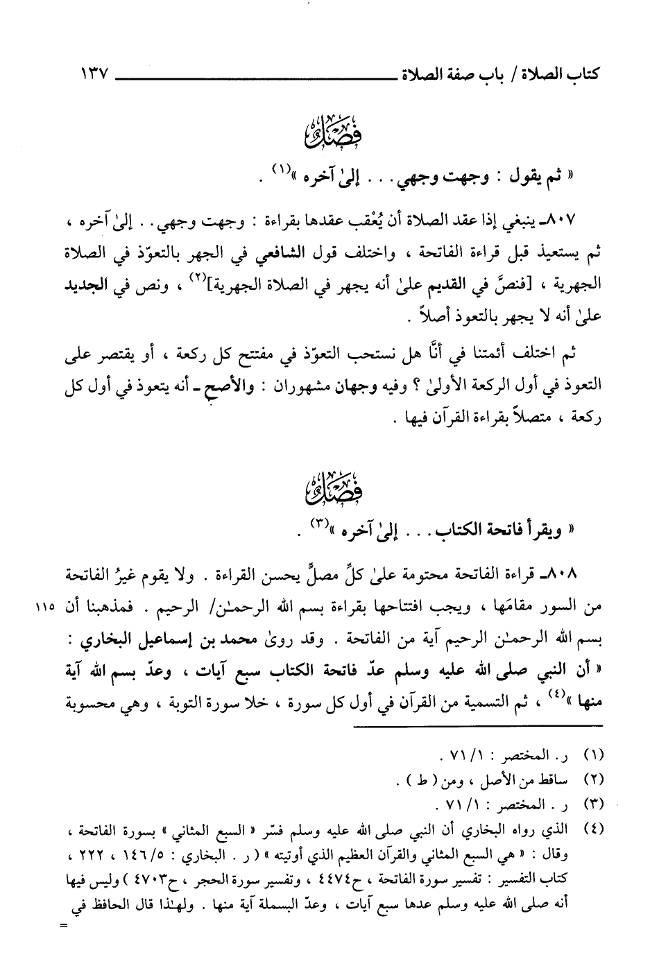 808 - قراءة الفاتحة محتومة على كلِّ مصلٍّ يحسن القراءة. ولا يقوم غيرُ الفاتحة من السور مقامَها، ويجب افتتاحها بقراءة بسم الله الرحمن الرحيم. فمذهبنا أن بسم الله الرحمن الرحيم آية من الفاتحة. وقد روى محمد بن إسماعيل البخاري: "أن النبي صلى الله عليه وسلم عدّ فاتحة الكتاب سبع آيات، وعدّ بسم الله آية منها" (¬4)، ثم التسمية من القرآن في أول كل سورة، خلا سورة التوبة، وهي محسوبة