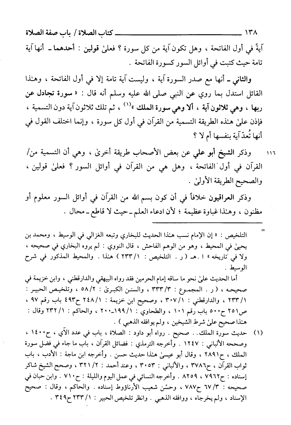 والثاني - أنها مع صدر السورة آية، وليست آية تامة إلا في أول الفاتحة، وهذا القائل استدل بما روي عن النبي صلى الله عليه وسلم أنه قال: "سورة تجادل عن ربها، وهي ثلاثون آية، ألا وهي سورة الملك" (¬1)، ثم تلك ثلاثون آية دون التسمية، فإذن على هذه الطريقة التسمية من القرآن في أول كل سورة، وإنما اختلف القول في أنها تُعدّ آية بنفسها أم لا؟