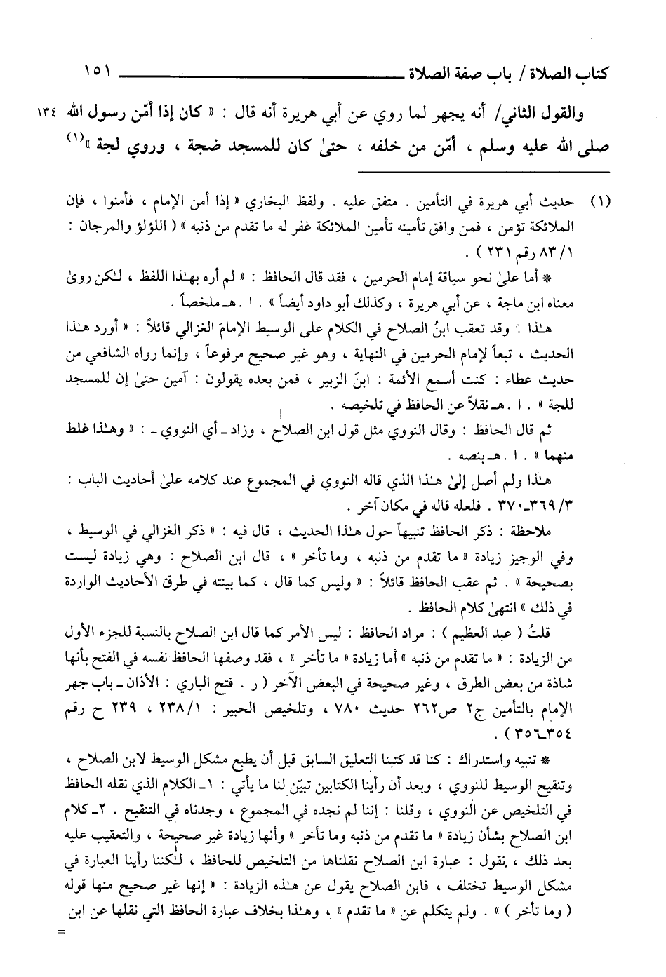 * تنبيه واستدراك: كنا قد كتبنا التعليق السابق قبل أن يطبع مشكل الوسيط لابن الصلاح، وتنقيح الوسيط للنووي، وبعد أن رأينا الكتابين تبيّن لنا ما يأتي: 1 - الكلام الذي نقله الحافظ في التلخيص عن النووي، وقلنا: إننا لم نجده في المجموع، وجدناه في التنقيح. 2 - كلام ابن الصلاح بشأن زيادة " ما تقدم من ذنبه وما تأخر " وأنها زيادة غير صحيحة، والتعقيب عليه بعد ذلك، نقول: عبارة ابن الصلاح نقلناها من التلخيص للحافظ، لكننا رأينا العبارة في مشكل الوسيط تختلف، فابن الصلاح يقول عن هذه الزيادة: "إنها غير صحيح منها قوله (وما تأخر) ". ولم يتكلم عن "ما تقدم"، وهذا بخلاف عبارة الحافظ التي نقلها عن ابن =