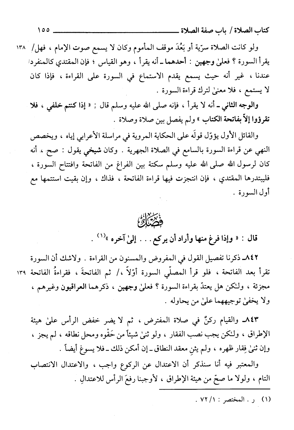 842 - ذكرنا تفصيل القول في المفروض والمسنون من القراءة. ولا شك أن السورة تقرأ بعد الفاتحة، فلو قرأ المصلّي السورة أوّلاً، ثم الفاتحةَ، فقراءةُ الفاتحة مجزئة، ولكن هل يعتدّ بقراءة السورة؟ فعلى وجهين، ذكرهما العراقيون وغيرهم، ولا يخفى توجيههما على من يحاوله.