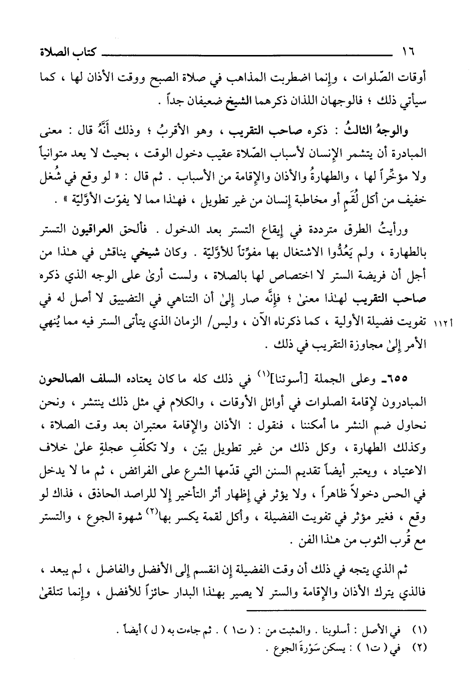655 - وعلى الجملة [أسوتنا] (¬1) في ذلك كله ما كان يعتاده السلف الصالحون المبادرون لإِقامة الصلوات في أوائل الأوقات، والكلام في مثل ذلك ينتشر، ونحن نحاول ضم النشر ما أمكننا، فنقول: الأذان والإِقامة معتبران بعد وقت الصلاة، وكذلك الطهارة، وكل ذلك من غير تطويل بيّن، ولا تكلّفِ عجلةٍ على خلاف الاعتياد، ويعتبر أيضاً تقديم السنن التي قدّمها الشرع على الفرائض، ثم ما لا يدخل في الحس دخولاً ظاهراً، ولا يؤثر في إِظهار أثر التأخير إِلا للراصد الحاذق، فذاك لو وقع، فغير مؤثر في تفويت الفضيلة، وأكل لقمة يكسر بها (¬2) شهوة الجوع، والتستر مع قرب الثوب من هذا الفن.