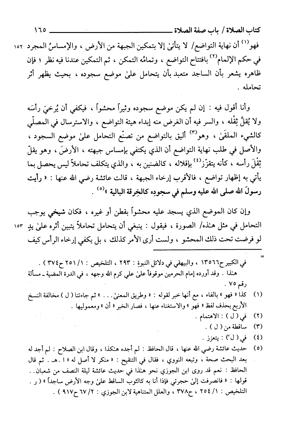 (¬5) حديث عائشة رضي الله عنها، قال الحافظ: لم أجده هكذا، وقال ابن الصلاح: لم أجد له بعد البحث صحة، وتبعه النووي، فقال في التنقيح: "منكر لا أصل له" ا. هـ. ثم قال الحافظ: نعم قد روى ابن الجوزي نحو هذا في حديث عائشة ليلة النصف من شعبان .. قولها: "فانصرفت إلى حجرتي فإذا أنا به كالثوب الساقط. على وجه الأرض ساجداً" (ر. التلخيص: 1/ 254، ح 378، والعلل المتناهية لابن الجوزي: 2/ 67 ح 917).